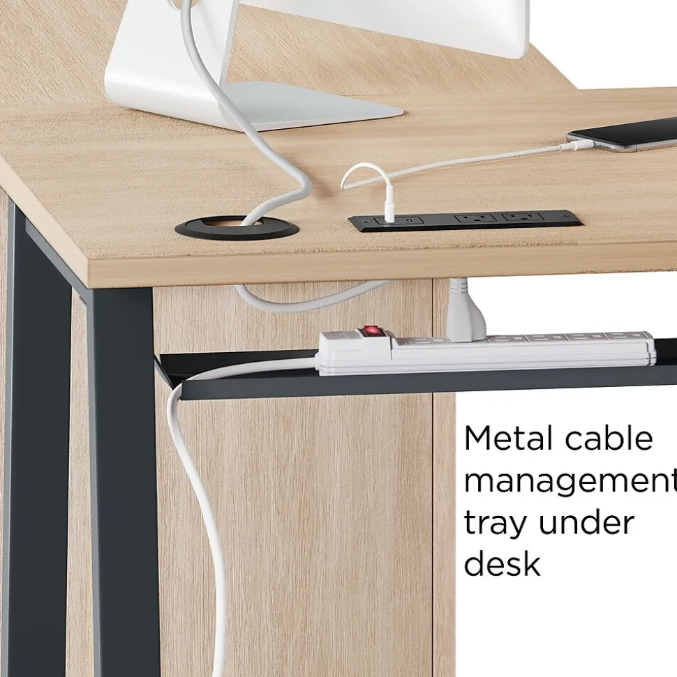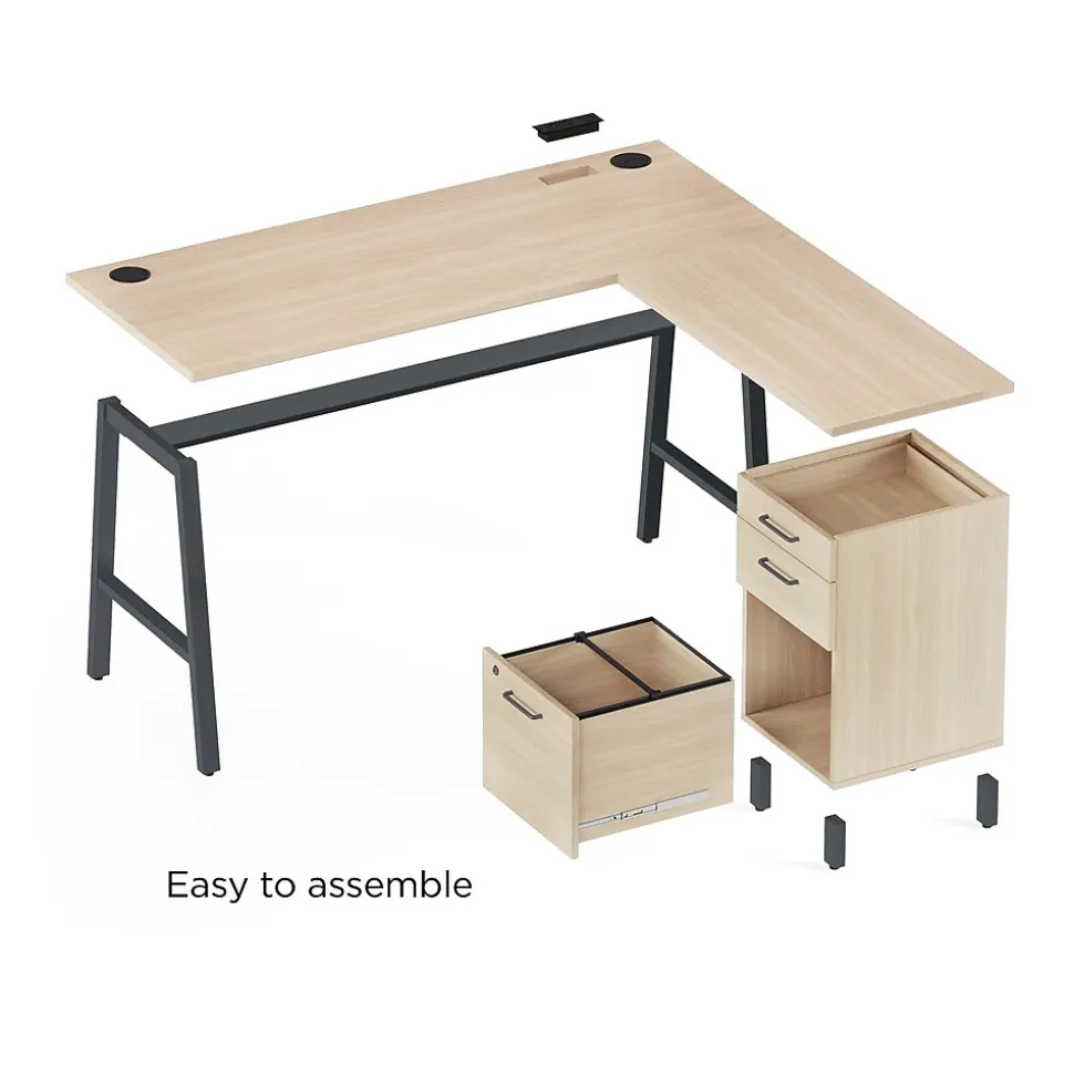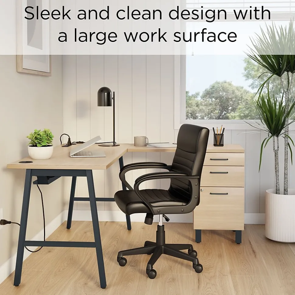 Store documents and stationery at work with this L-shaped desk. The laminate top adds a lasting splash of sophistication to accentuate your office, while the metal A-frame offers solid support. With three lockable drawers, this desk provides secure storage for office supplies, and the drawer glides allow seamless access to stored items. This Union & Scale™ Essentials natural L-shaped desk features a hidden cable management tray to neatly organize wires and meets BIFMA standards for reliability.