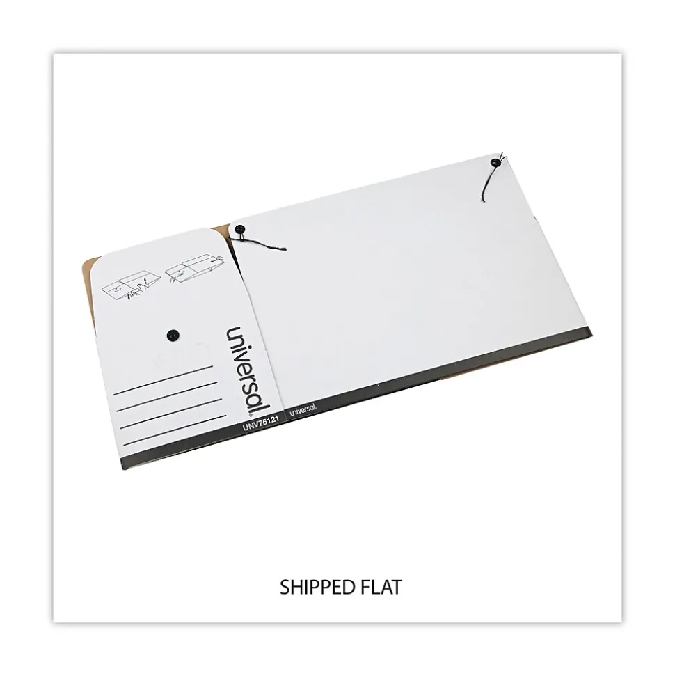 Keep the previous year’s marketing figures secure but within easy reach with this Universal string-and-button box. Fitting letter-size documents, this storage box can be resealed repeatedly, and because the surface is white, it’s easy to note the contents for quick retrieval. This Universal string-and-button box has built-in carry handles for transporting from office to storeroom and is constructed with sturdy corrugated fiberboard that contains 59 percent postconsumer recycled content.