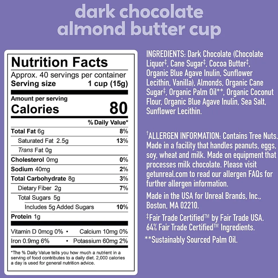 - UNREAL QUALITY: our cups are made in small batches and are certified vegan, gluten free, Fair Trade, and non-GMO. We also believe in using certified sustainable palm oil, and you’ll never find any artificial flavors, preservatives, or fillers!