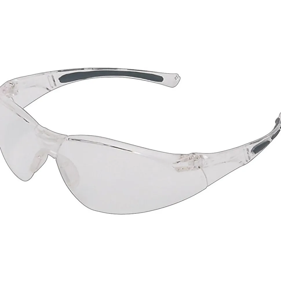 Protect eyes from dust, debris and harmful irritants with these safety glasses engineered for durability and comfort. These wraparound glasses feature a non-slip nose bridge and flexible temples with padded inserts for all-day comfort. The rugged polycarbonate construction of these glasses meets ANSI standards for impact protection. These Uvex North A800 safety glasses are finished with a tough, transparent anti-scratch coating for added durability and long-lasting performance in industrial settings.