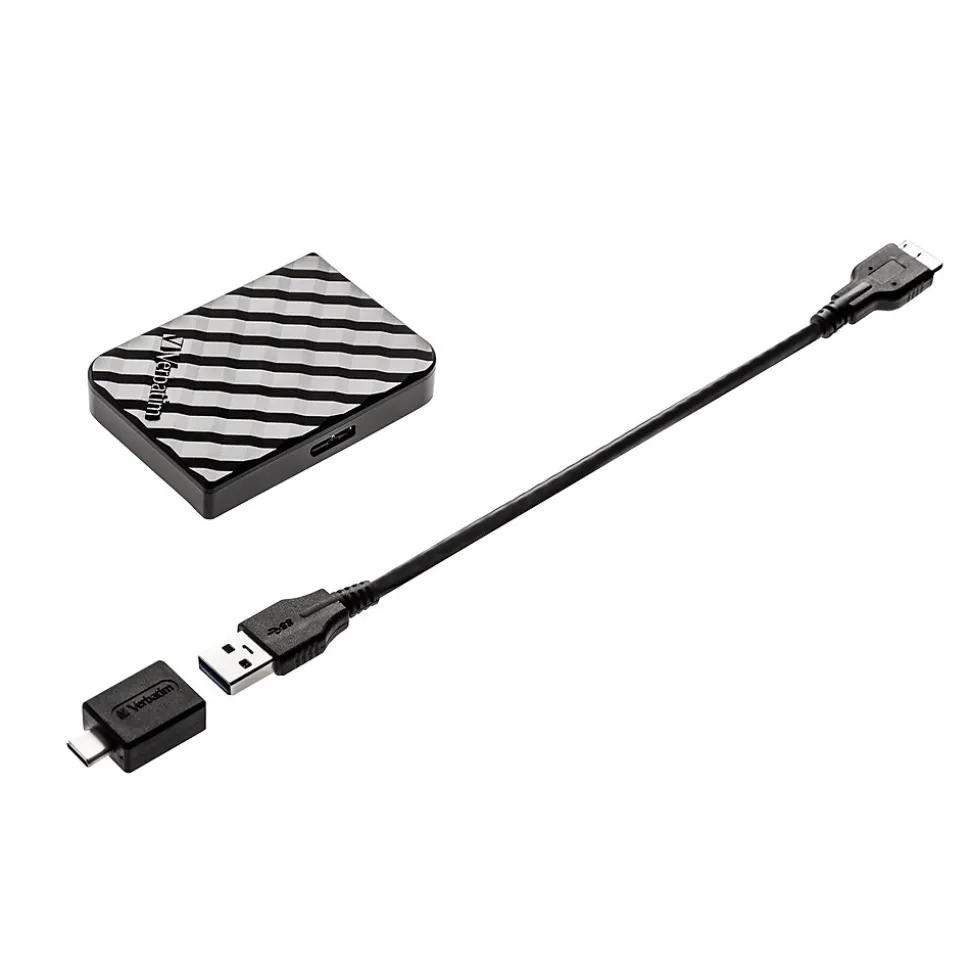 Providing a fast and safe solution for storing and backing up your file, this SSD is ultra small and lightweight, weighing less than a pound in a stylish black 3D design.Compatible with both PC and Mac operating systems, the SSD interface is USB 3.2 GEN 1* for super-fast data transfer speeds. The SSD handles large data transfers quickly – ideal for video editing, moving large amounts of data or maximizing gaming performance. The SSD includes a Micro-B to USB-A cable as well as a USB-A to USB-C adapter for connection to a range of devices. Nero Backup software is also available with this SSD, providing the ability to backing up files on a compatible PC**. Verbatim’s Store ‘n’ Go External SSDs are backed by a 2-year limited warranty.*For optimal performance, the drive must be connected to a USB 3.2 GEN 1 host controller **Actual transfer speeds depend on file size, computer performance, and operating system