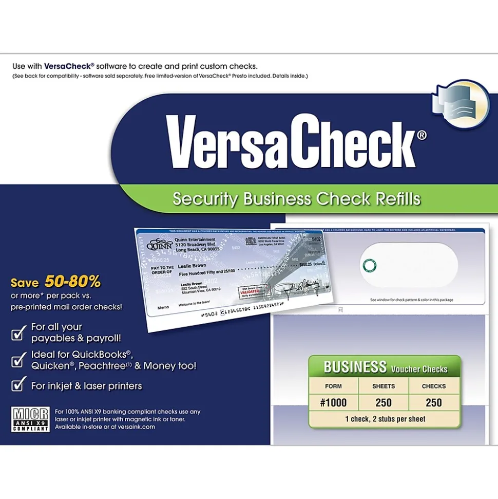 - Compatible with: VersaCheck, QuickBooks, Quicken, MS Money, and more