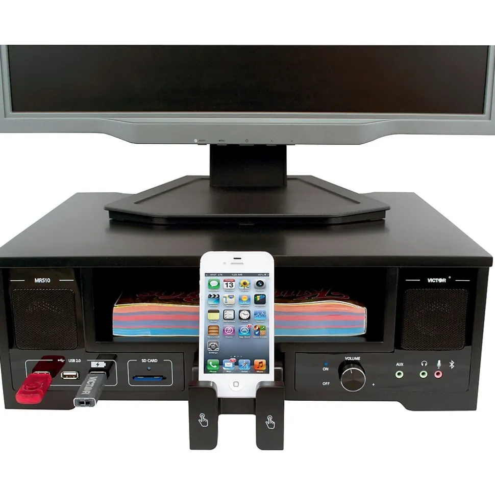 - Monitor Stand Featuring Bluetooth Speakers, USB Hub, Card Reader, and Auxiliary Input