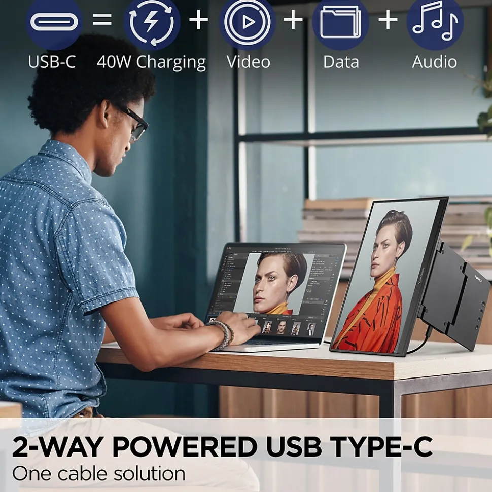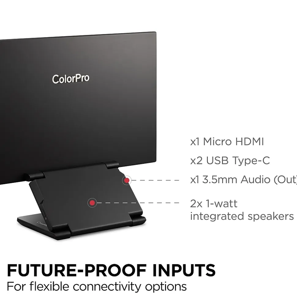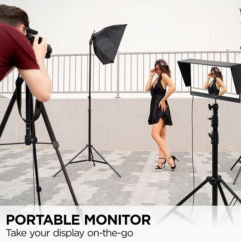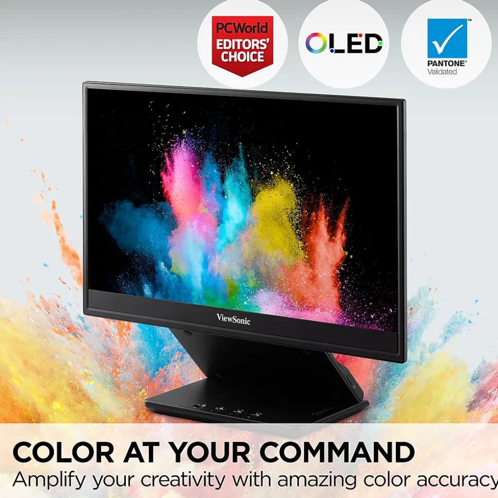 The ViewSonic ColorPro VP16-OLED is a 15.6” portable monitor with native Full HD 1080p resolution and advanced OLED technology for incredible visual performance on the go. The VP16-OLED is Pantone Validated and factory calibrated to deliver richer color uniformity and enhanced details, ensuring that it meets the demands of professional content creators. A flexible and foldable ergonomic stand delivers easy height adjustment for the perfect viewing angle in a variety of environments. A convenient tripod mount is integrated into the stand so that the display can be used as a high-quality photo or video preview screen for fine adjustments in the field, while a protective screen cover also doubles as a shading hood for a “dark room” effect. In addition, versatile connectivity options include two USB-C ports for 2-way charging, as well as micro HDMI and a headphone jack.