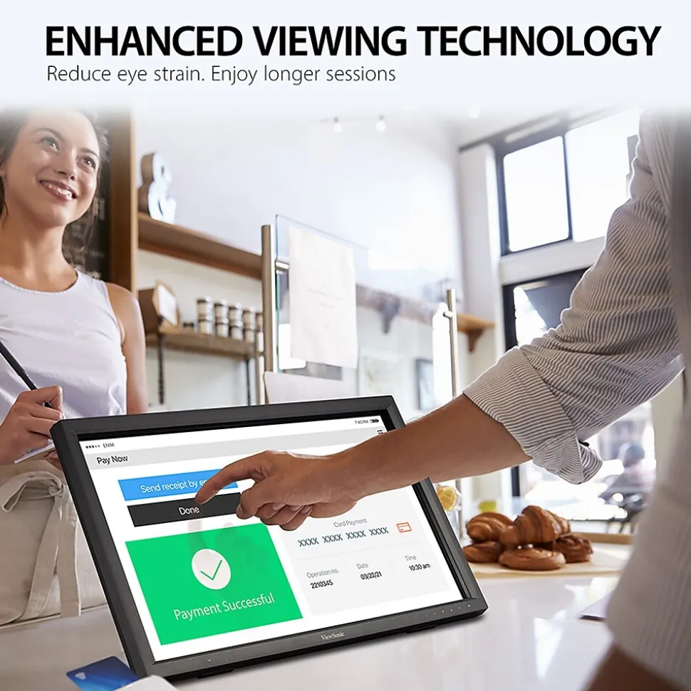 Great for public kiosks, POS displays, and other retail and commercial applications, the ViewSonic TD2423d is a 24” touch display with 10-point IR touch technology that lets users pinch, zoom and swipe for fast and intuitive navigation. With Full HD 1920×1080 resolution, 3000:1 static contrast ratio and 7H screen hardness, the TD2423d delivers sharp and bright images combined with durability for high-traffic applications. Flexible connectivity options include HDMI, DisplayPort, VGA, DVI, and a USB hub to connect your peripherals and accessories. VESA-mount compatibility offers additional convenience and flexibility for 3rd party stands and mounts. What’s more, ViewSonic’s exclusive ViewMode feature provides intuitive presets that deliver optimized screen performance in different applications. In addition, Flicker-Free technology and a Blue Light Filter help to eliminate eyestrain from extended viewing periods for improved productivity. Whether in retail or deployed in a high-traffic commercial setting, its scratch-resistant surface stands up to heavy use and safeguards its high quality touch experience. Combine this display with ViewSonic’s Android and Windows media players for a perfect kiosk solution.
