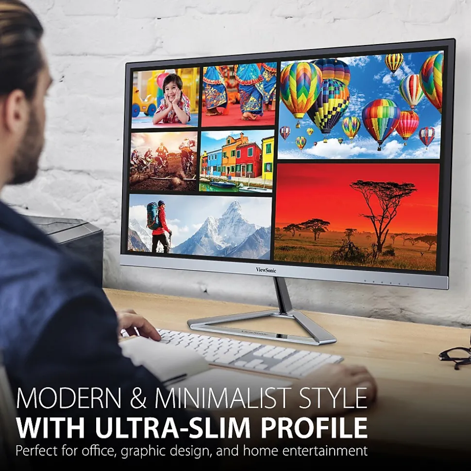 The ViewSonic VX2776-smhd is a sleek 27-Inch Full HD monitor with a modern and minimalist style perfect for home use. With SuperClear IPS Panel technology, this monitor offers best-in-class screen performance with ultra-wide viewing angles. A premium ID includes an ultra-slim profile, unique desktop stand, and a sleek edge-to-edge frameless design, that when combined with vivid 1920×1080 resolution and dual speakers, deliver an immersive viewing experience for home entertainment and multimedia applications. HDMI, DisplayPort, and VGA inputs offer flexible connectivity options for both computing and gaming environments, while ViewSonic’s exclusive ViewMode feature provides intuitive presets for optimized screen performance in different applications. In addition, Flicker-Free technology and a Blue Light Filter help to minimize eye strain from extended viewing periods. With ViewSonic’s industry-leading 3-year limited warranty, this monitor is a solid long-term investment that combines style and high performance for the home.