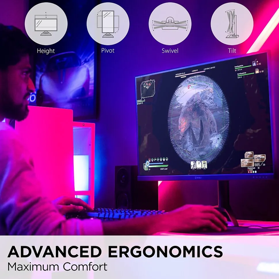 - ERGONOMIC STAND: Advanced ergonomics (tilt, swivel, rotate and height) for all-day comfort