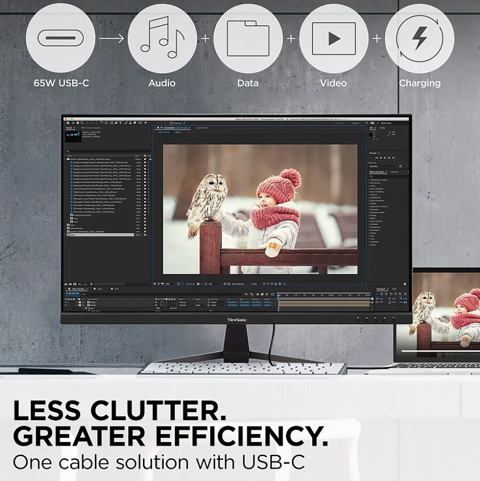 Whether you’re looking to work with greater clarity or experience entertainment in a whole new light, the ViewSonic VX3267U-2K 32” monitor takes your viewing experience to a new level of immersion. This 2K monitor uses state-of-the-art IPS panel technology to deliver stunning visuals with ultra-wide viewing angles. Enjoy 2560 x 1440 resolution on a bezel-free, ultra-wide display for an edge-to-edge viewing experience unlike anything you’ve ever seen. Immerse yourself in vibrant true-to-life colors and enhanced contrast thanks to HDR10 content support. This powerful home office monitor features USB 3.2 Type-C connectivity for video, audio, data and up to 65W of charging power over a single cable. Connect additional devices via HDMI and DisplayPort inputs.