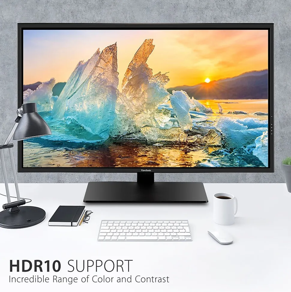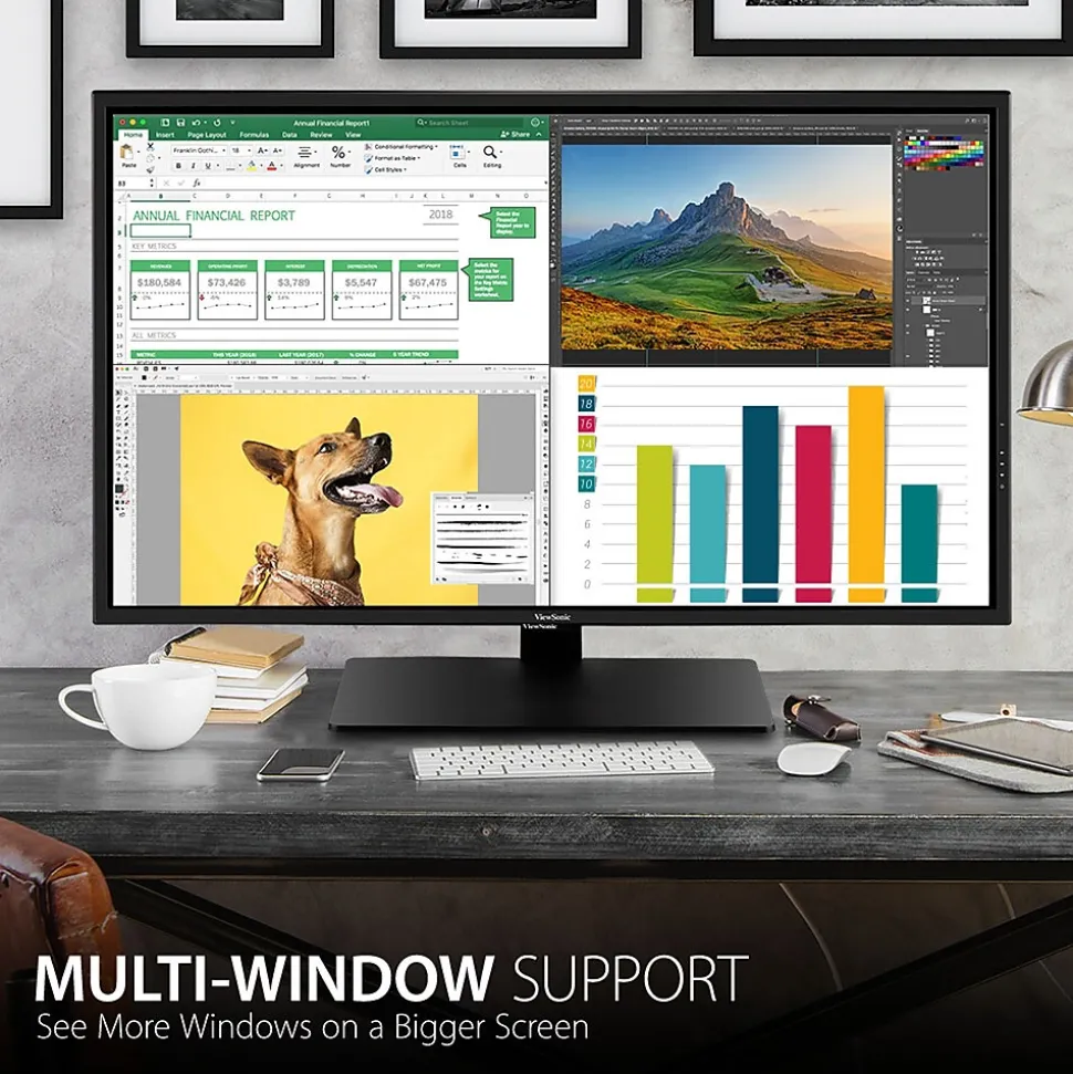 Designed with productivity in mind, the ViewSonic VX4381-4K combines incredible 4K resolution, a sleek narrow-bezel design, and an expansive 43-Inch (42.5 viewable) screen so you can see all and do all from a single monitor. Featuring an MVA panel and 3840×2160 resolution, this monitor offers best-in-class screen performance with incredibly sharp and detailed visuals, while HDR10 content support delivers a high dynamic range of vivid color and contrast. Flexible and versatile for any office application ranging from document editing to graphic design, the VX4381-4K includes connectivity options such as DisplayPort 1.4, mini DisplayPort 1.4, DisplayPort Out, HDMI 2.0, and 3-USB ports. ViewSonic’s MultiPicture functionality allows for efficient multitasking by providing simultaneous viewing of up to four split windows, while full ergonomic functionality delivers maximum comfort and enhanced productivity. With an energy-saving Eco-mode feature and ViewSonic’s industry-leading 3-year limited warranty, this monitor is a solid long-term investment, delivering great power savings while boosting productivity for a variety of business applications.