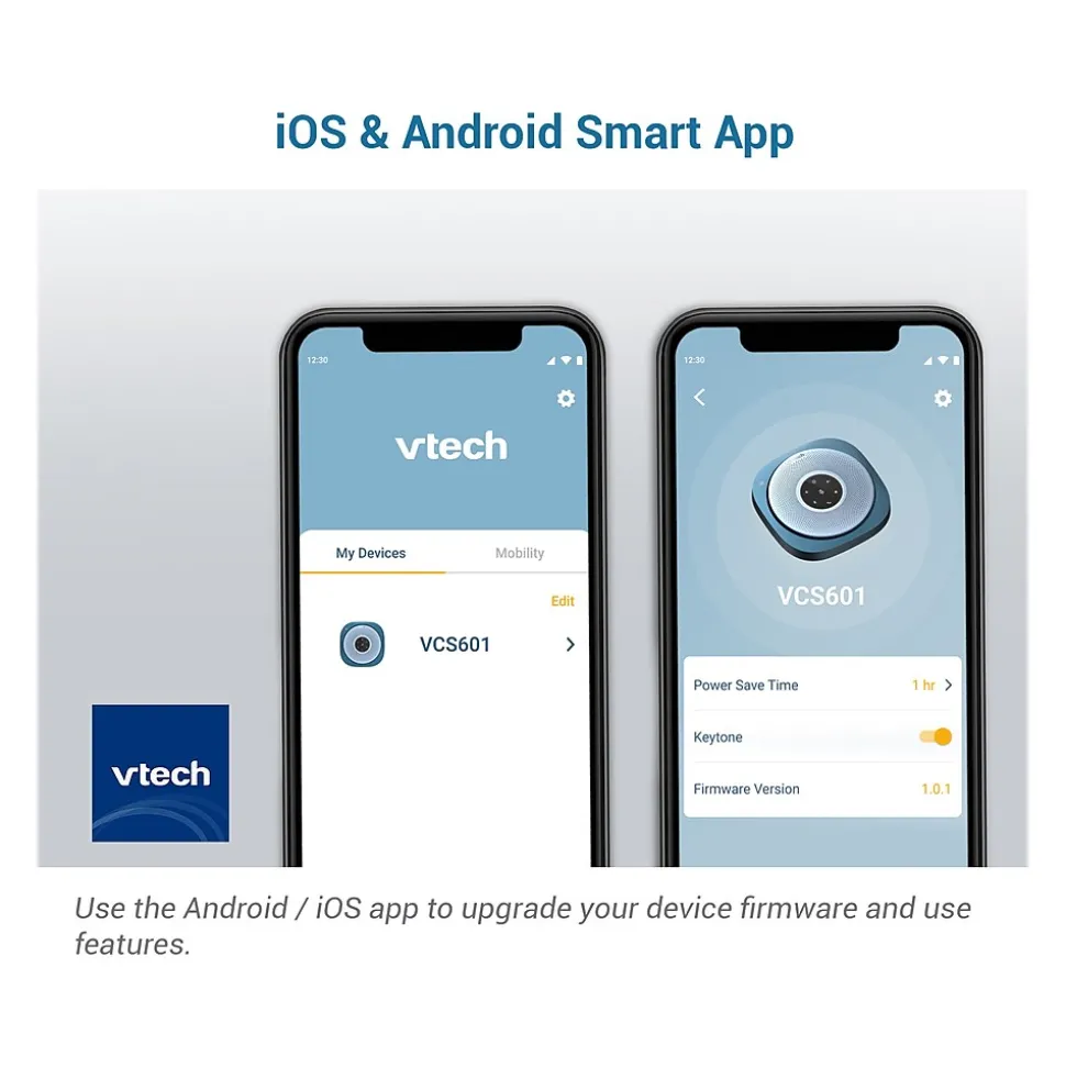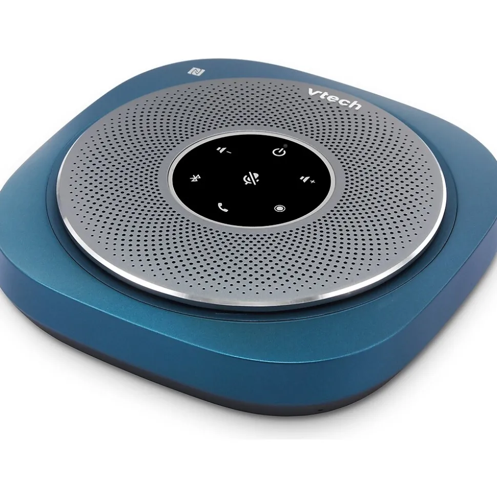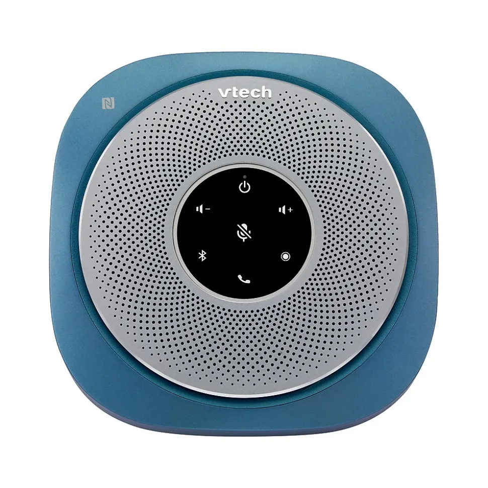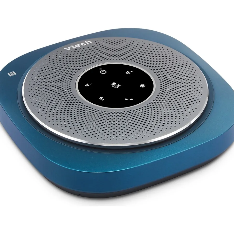 The VTech VCS601 Bluetooth conference speakerphone offers quick and easy connection to your smartphone, tablet, or laptop to meet your communication needs. The speakerphone includes six microphones to provide true 360-degree coverage to ensure users are heard from every angle and distance, while the echo cancellation helps eliminate background noise and ensure crisp, clear communication. The large 3W speaker provides a premium sound performance for listening to music while you work or take that important audio- or videoconference call. The built-in 5200mAh battery supports up to 24 hours of talk time and doubles as a USB power bank, so you can keep your smart devices charged while on the go.
