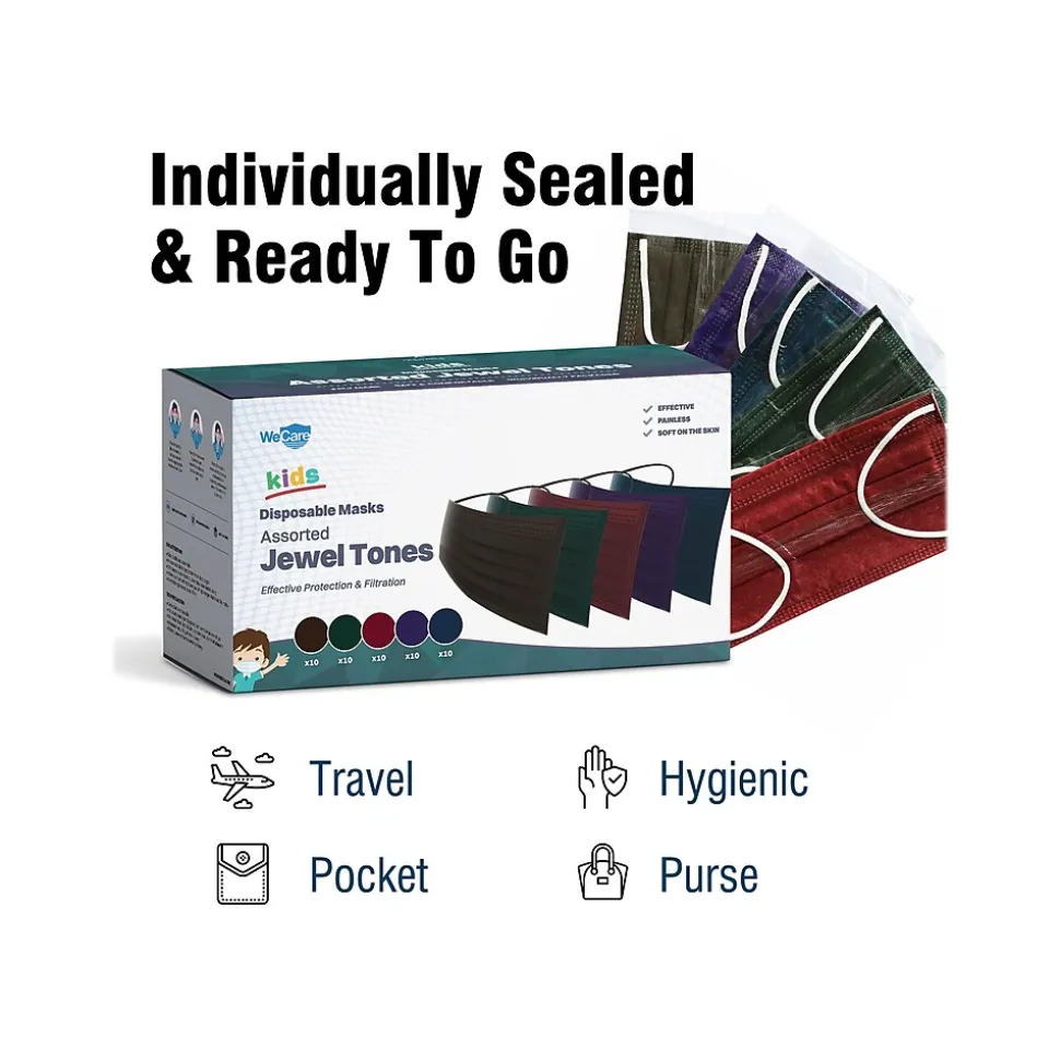 - Masks come in assorted jewel tones and feature an adjustable metal wire that runs along the top as a nose clip