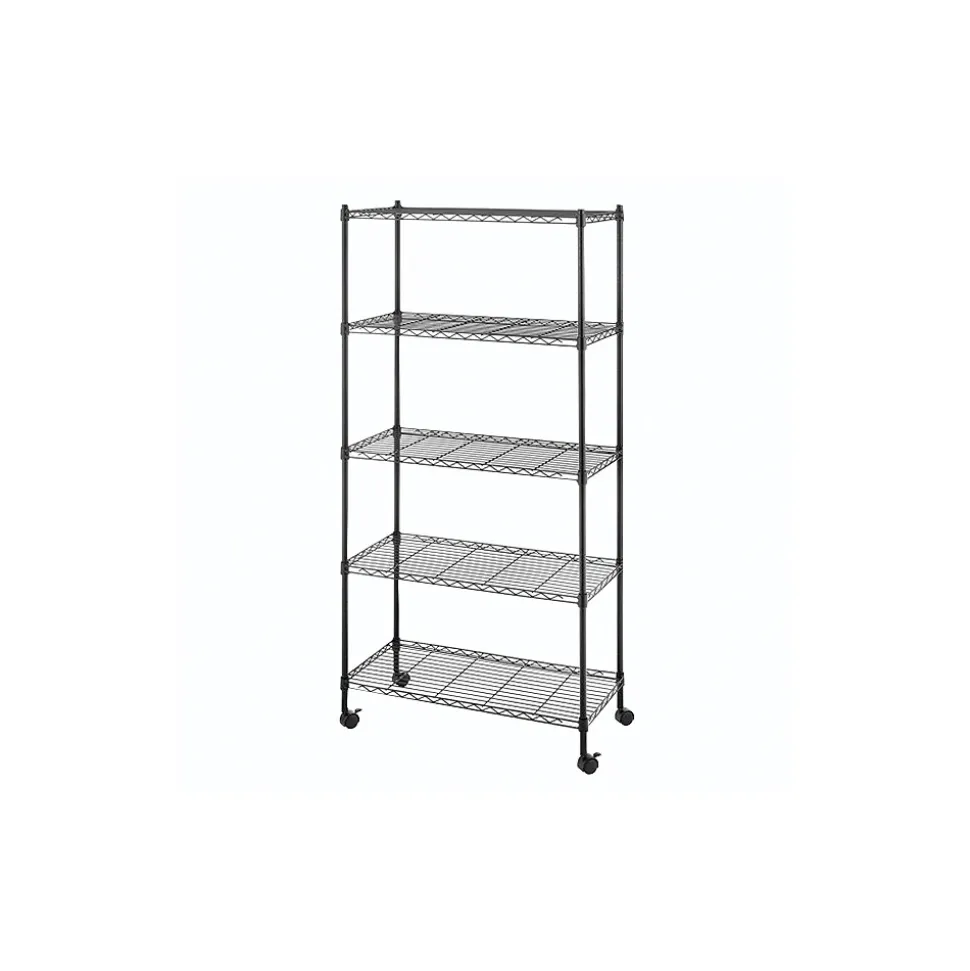 The Whitmor Supreme 5-tier 59.5″ rolling cart in black, has five convenient shelves with raised edges to keep things from falling off. The chrome finish cart accommodates objects of various sizes. It has a steel frame with wheels on the base for easy mobility. This multipurpose utility cart is perfect for use in kitchen, garage and laundry room.