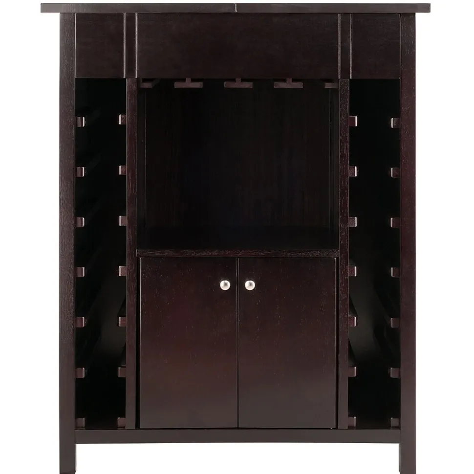 The Yukon Wine Cabinet is bold in its design and versatile in its storage. The cabinet top separates in the middle and slides open to reveal a hidden compartment, ideal for added storage or a secure place to pour. Two open slots run down the outside edges of the unit with a capacity to store 14 bottles. The front open shelf is fitted with a stemware rack, and a lower cabinet offers additional storage.Made of solid and composite wood in an Espresso finish. Model# 92655