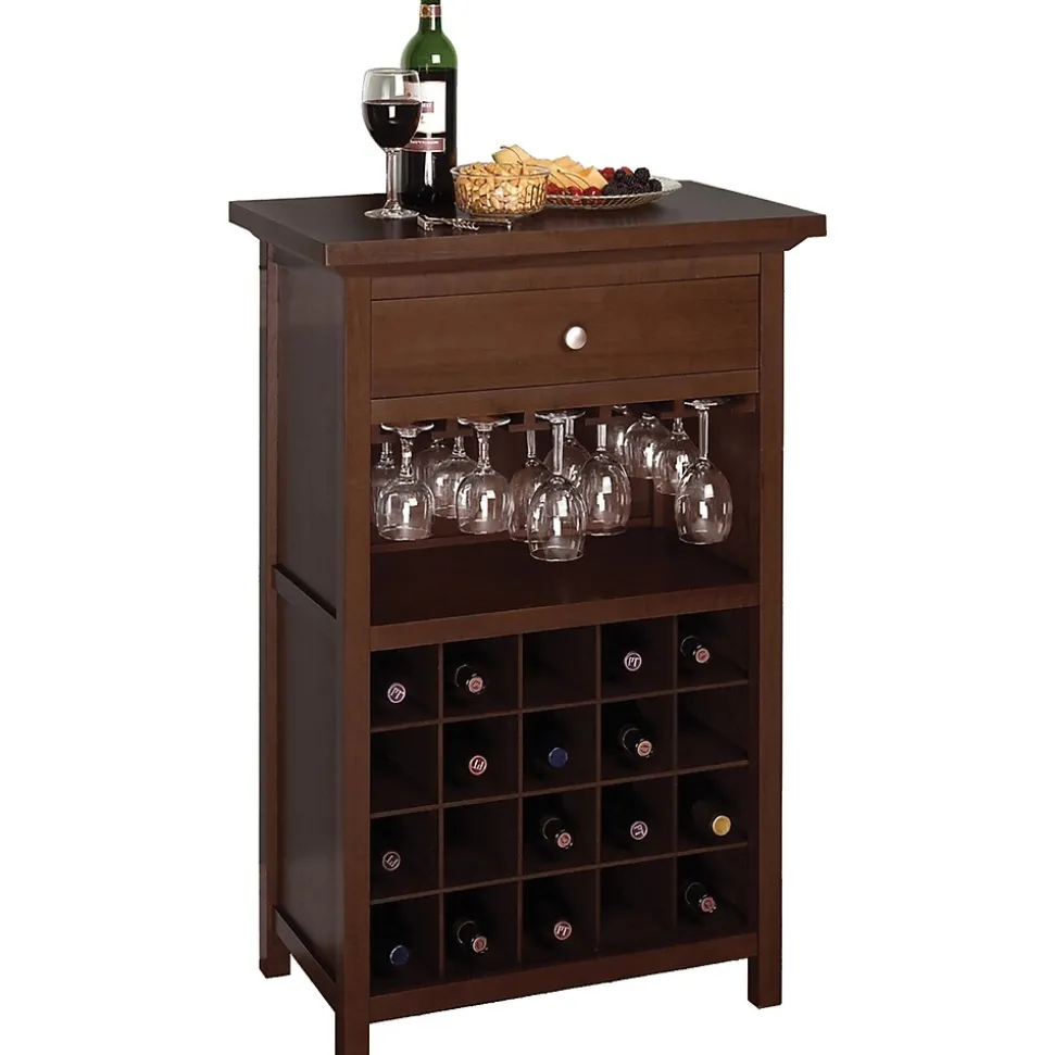 Winsome Wine cabinet has 20 bottles storage capacity and features racks to place goblets while drawers store wine accessories.Made of solid hardwood with walnut finish for durability and elegancy.