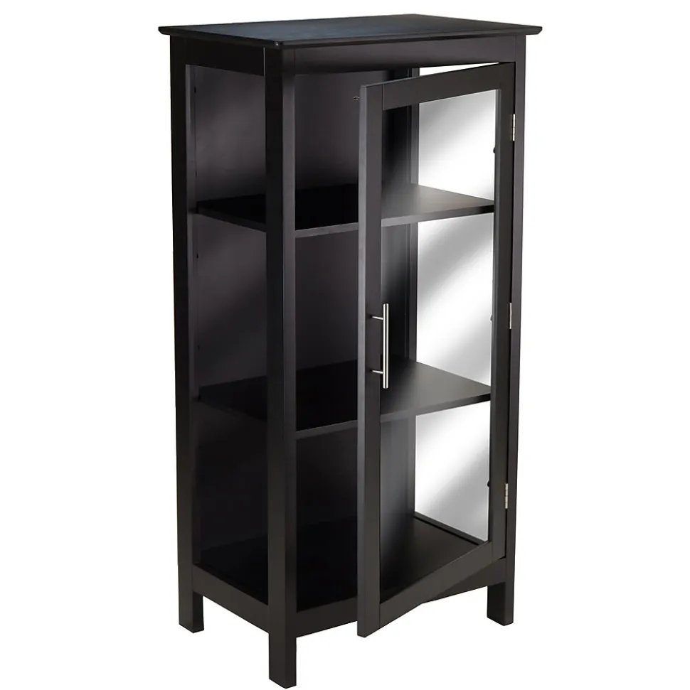 The Poppy Display Cabinet features tempered glass on three sides for easy viewing. Cabinet has three shelves; the top shelf is adjustable. Made of solid and composite wood in a sleek Black finish.