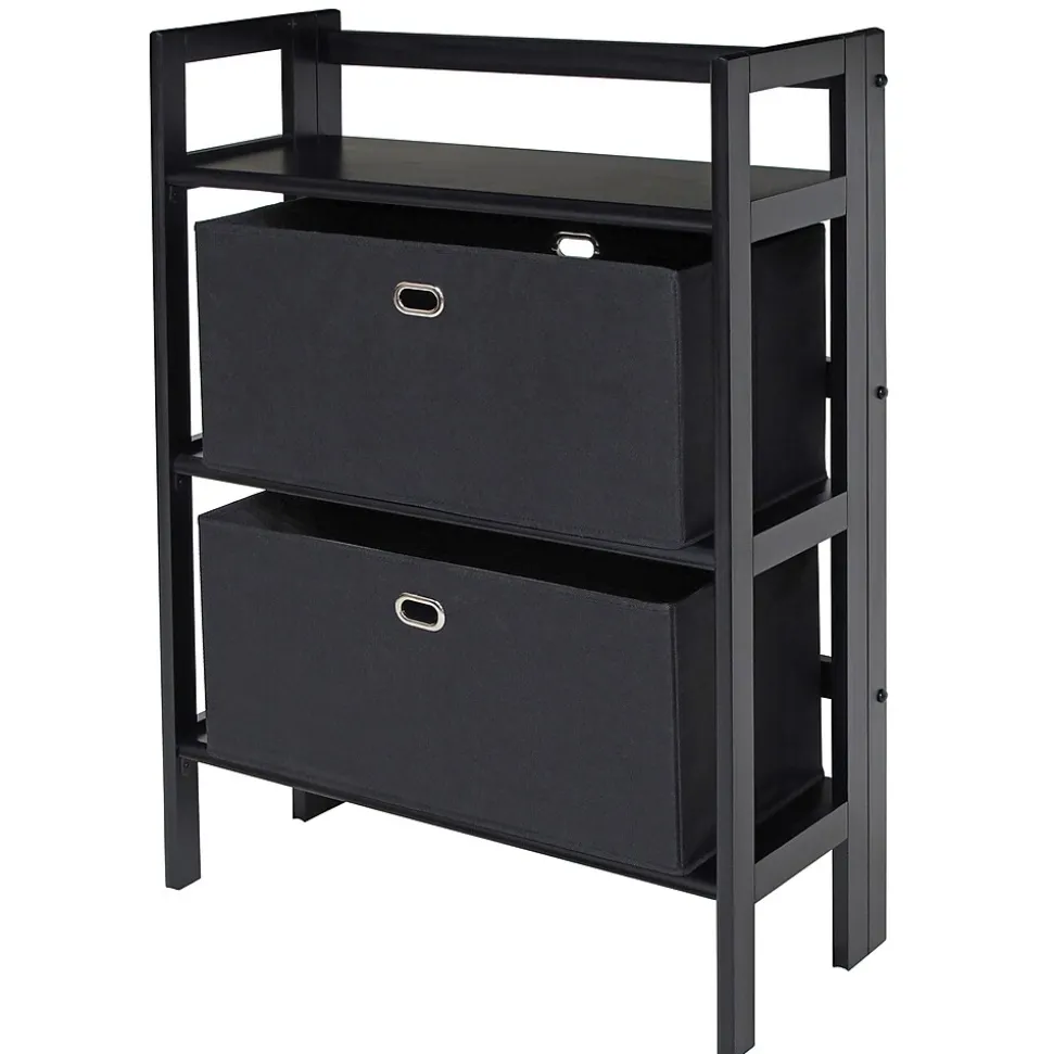 This 2-Tier Foldable Shelf is made of Solid Wood and finished in Black. The matching foldable baskets are constructed of sturdy fiberboard with Black fabric. Carrying them is easy and secure with metal ring handles. Two units can be stacked to provide additional vertical storage space.