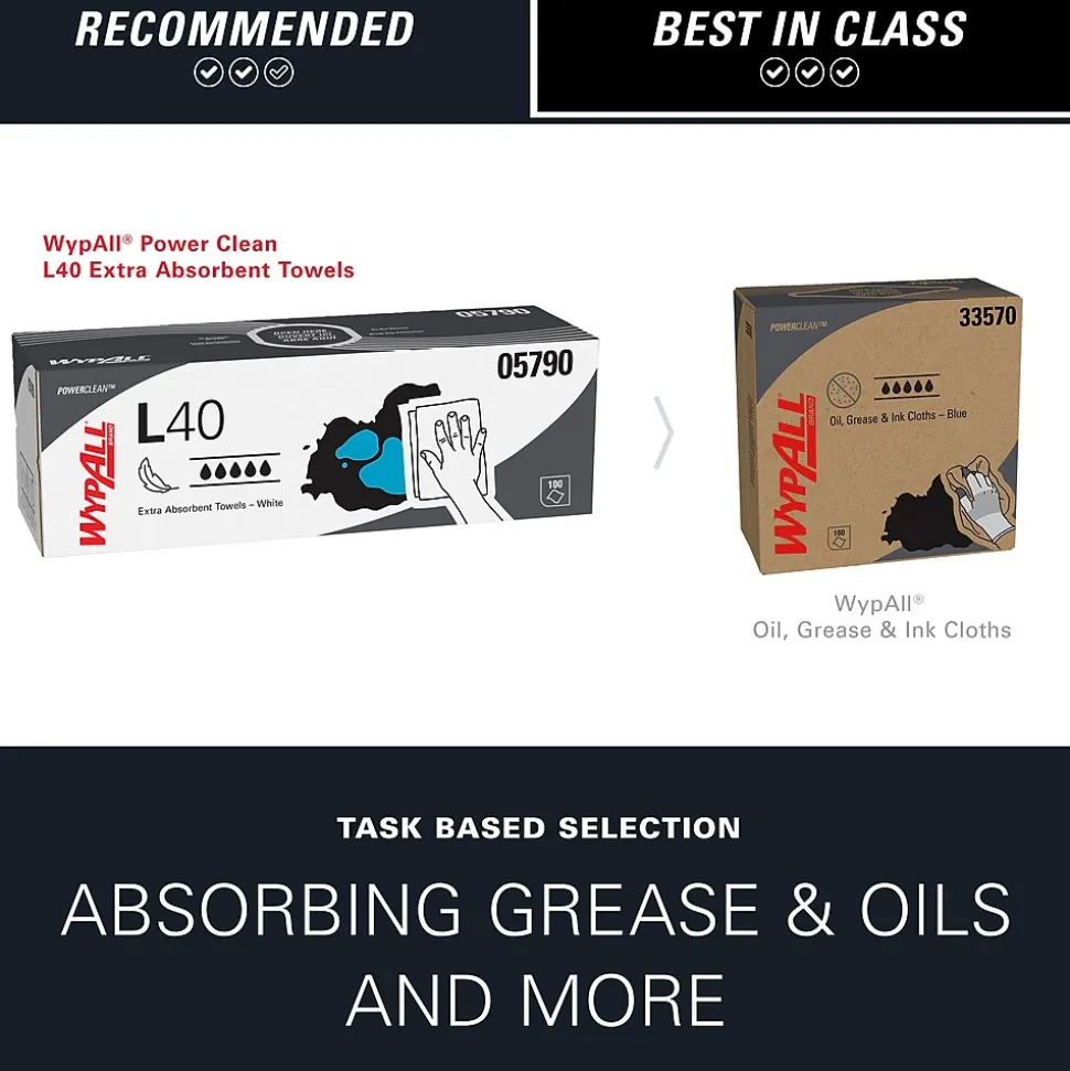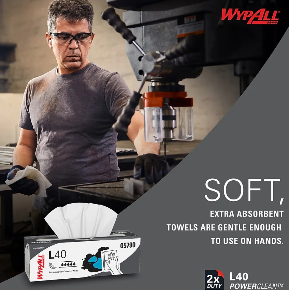 - 100 Sheets/Box; 9 Boxes of WypAll® PowerClean™ L40 Extra Absorbent Towels/Case; 900 Sheets/Case; White; Pop-Up Box; Limited Use Towels