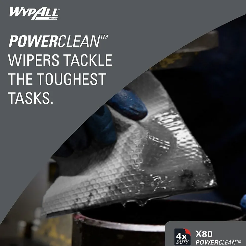 WypAll® is the number one brand of disposable wipes in the US and Canada. Maximize performance while minimizing time, effort and product waste. WypAll® PowerClean™ X80 Heavy Duty Cloths feature innovations like high-tech Hydroknit® fast-absorbing material and are durable for scrubbing. These contaminant-free commercial cloths are a favorite replacement for industrial cloth towels, which can harbor dangerous chemicals, such as lead (In a 2003 Gradient study, 100% of the sampled laundered shop towels tested, lead was detected at levels that may exceed health based exposure guidelines.). WypAll® PowerClean™ X80 Heavy Duty Cloths are made of soft pulp fibers, bonded to a polypropylene base sheet for absorbency and durability, making them suitable for removing dirt, oil, grime and solvents in industrial and manufacturing businesses. The reusable cloths are reinforced for strength when wet and dry. These bulk cloths are a great alternative – safer and more efficient – to replace laundered rental shop towels or and cleaning towels. Use them for heavy duty machine- and part-wiping, wiping metal shavings, prepping surfaces with solvents and cleaning rough surfaces. After all, every business gets dirty. But for the toughest grease and grime, you can trust WypAll® PowerClean™ X80 Heavy Duty Cloths.