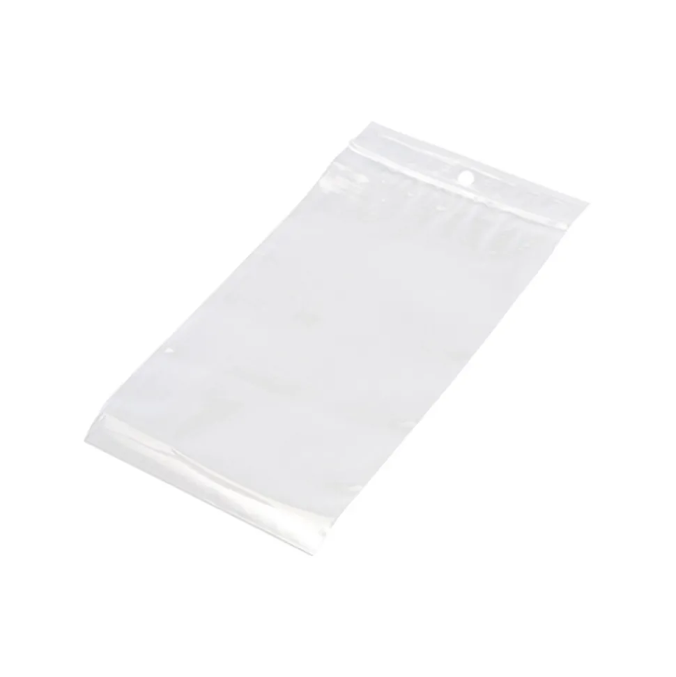 - Zip top closure with lip and hang hole