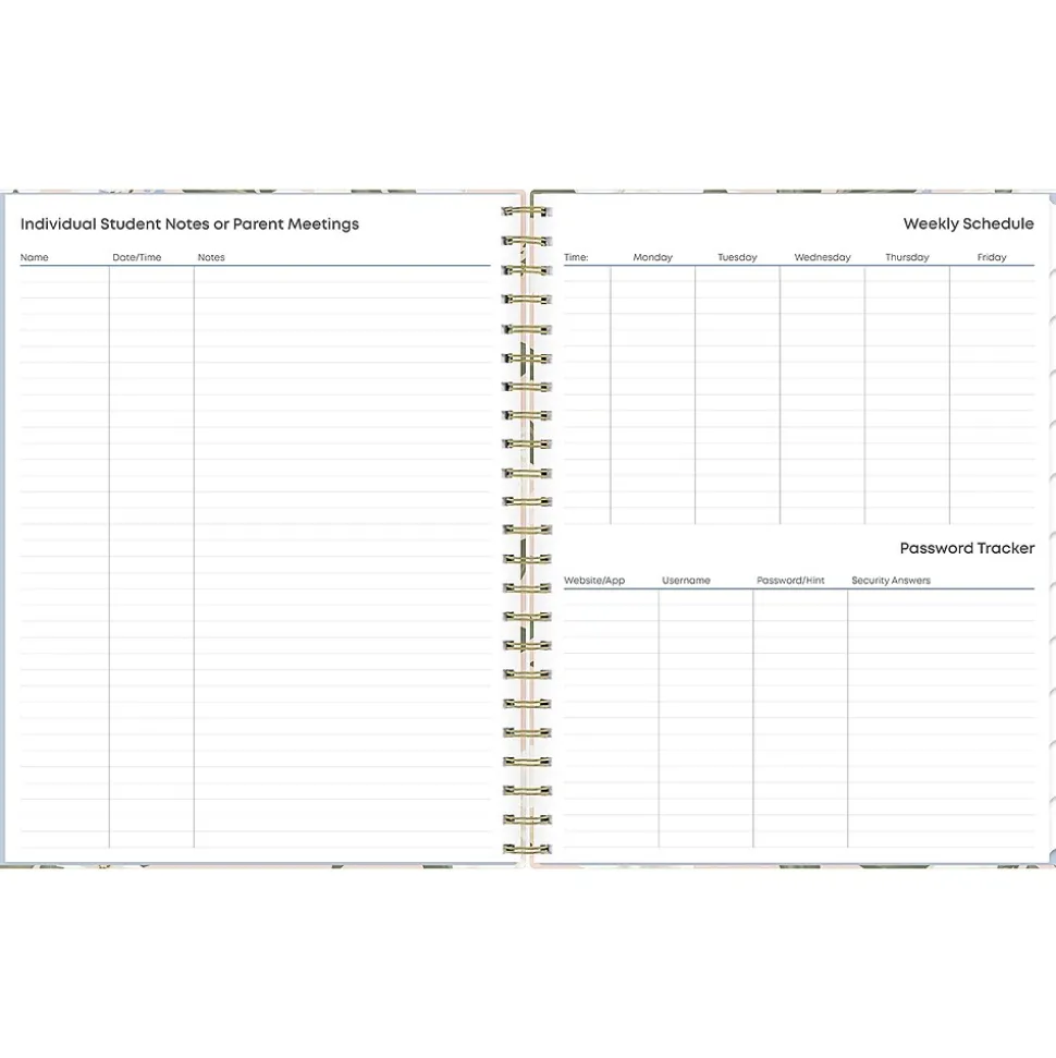 Blue Sky planners always make the grade. The Aminah Rose teacher lesson planner has weekly planning space for up to nine classes or subjects. The monthly pages are tabbed and offer plenty of room for notes. Extras include a storage pocket and pages for weekly activities, class birthdays, and holidays.