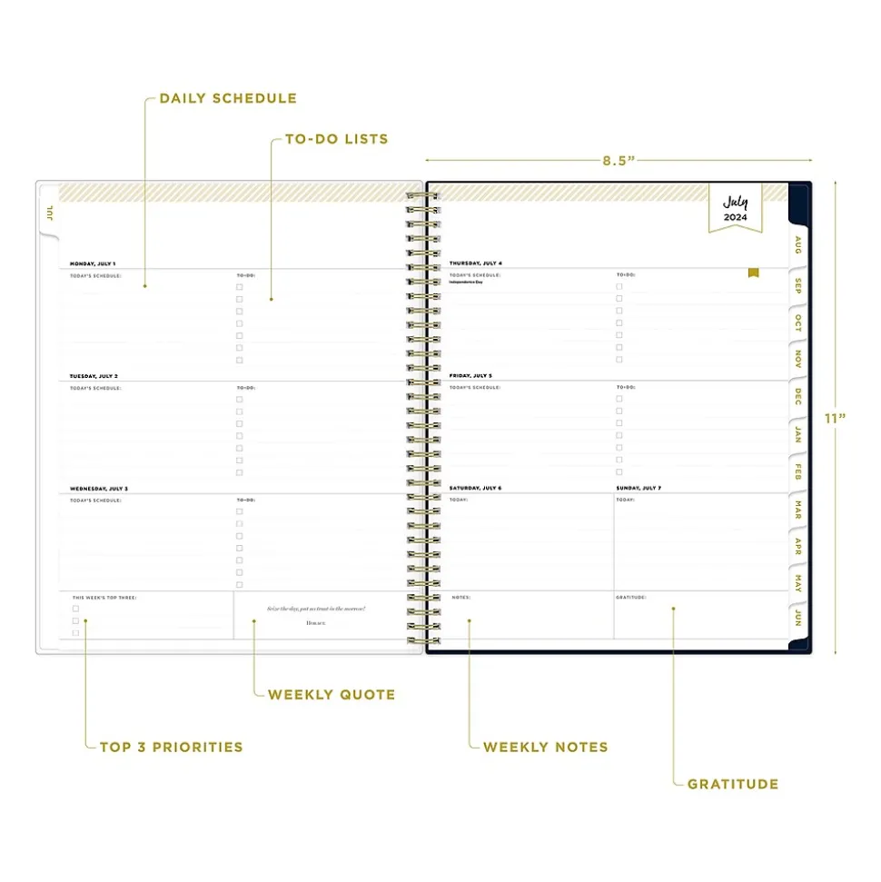- Weekly and monthly planner covers a 12-month academic date range from July 2024 to June 2025