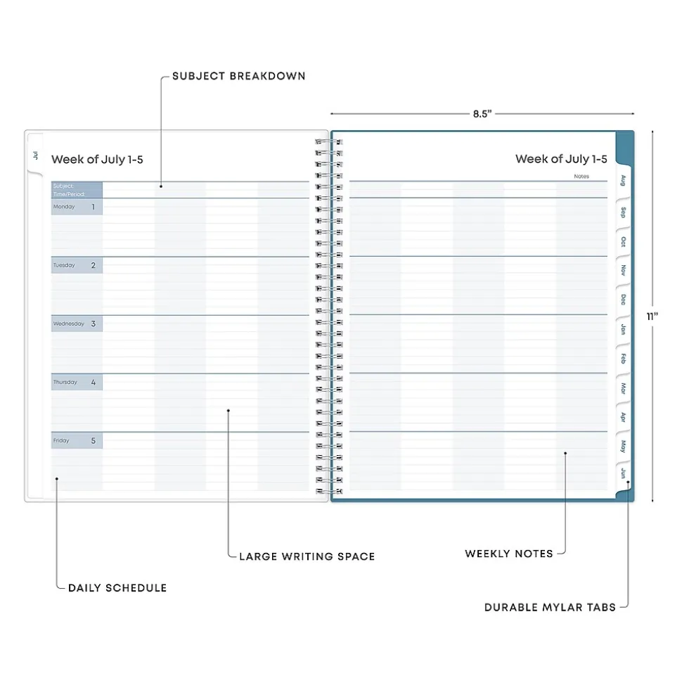 - Weekly spreads with planning space for up to nine classes or subjects; monthly pages are tabbed and offer plenty of room for notes