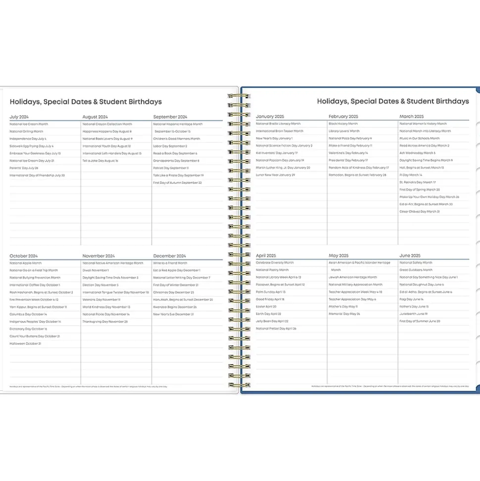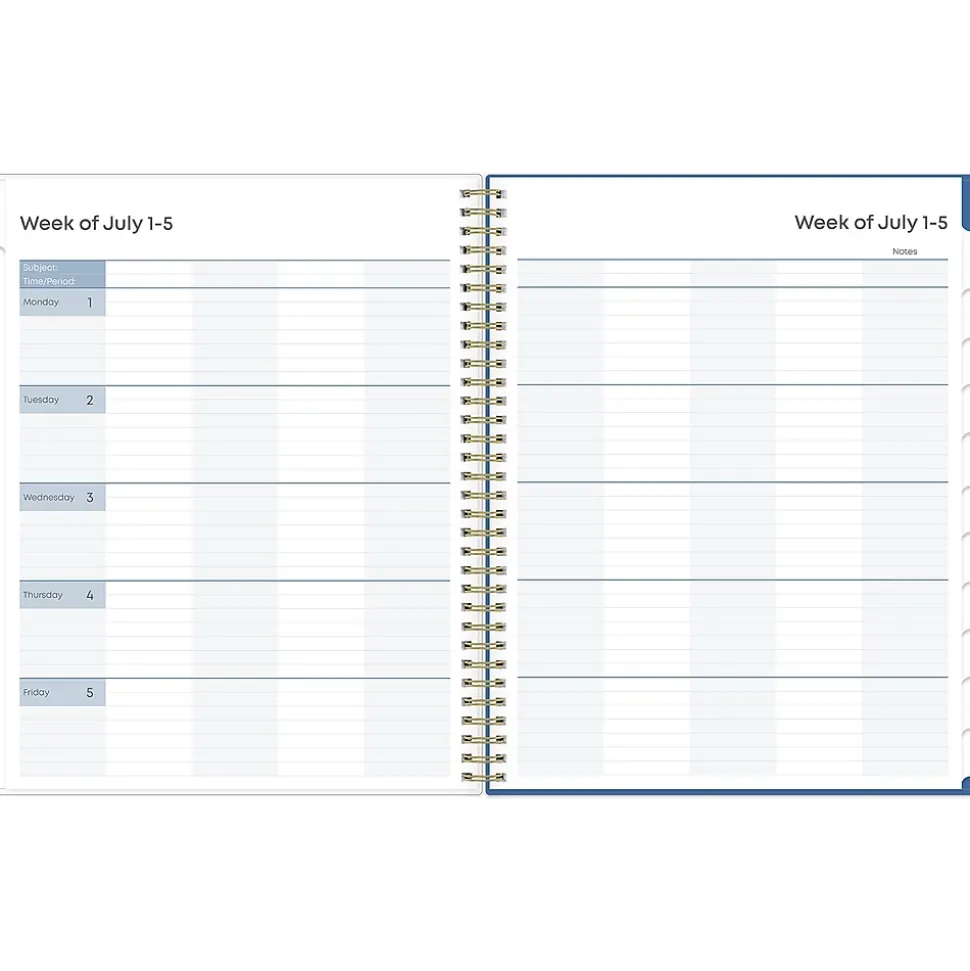 Blue Sky teacher lesson planners keep you focused and organized. The Raquel teacher lesson planner has weekly planning space for up to nine classes or subjects. The monthly pages are tabbed and offer plenty of room for notes. Extras include a storage pocket and pages for weekly activities, class birthdays, and holidays.