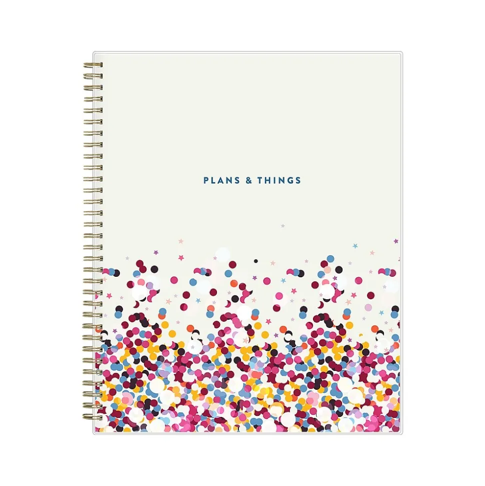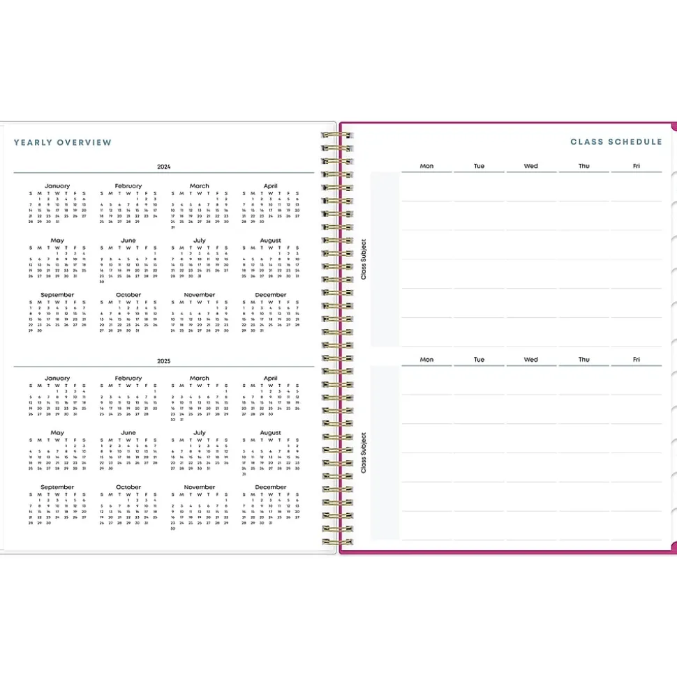The Blue Sky Star Confetti Bright student planner includes a class schedule page, weekly planning pages, monthly views with quotes, project and assignment trackers, and a storage pocket. Perfect for high school students, this 2024-2025 student planner helps you feel less stressed and ready to succeed.