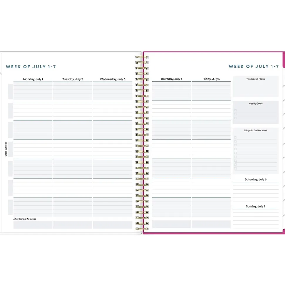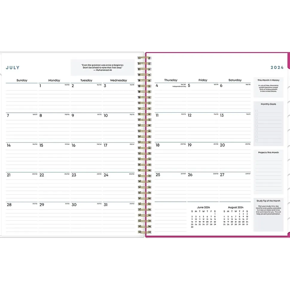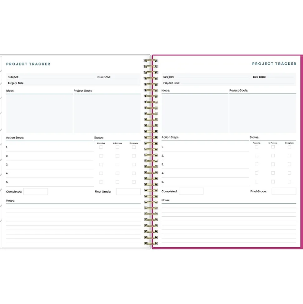 - Features one month per two pages and one week per two pages, with monthly quotes, weekly goals, projects this month section, class schedule, assignment and project tracker