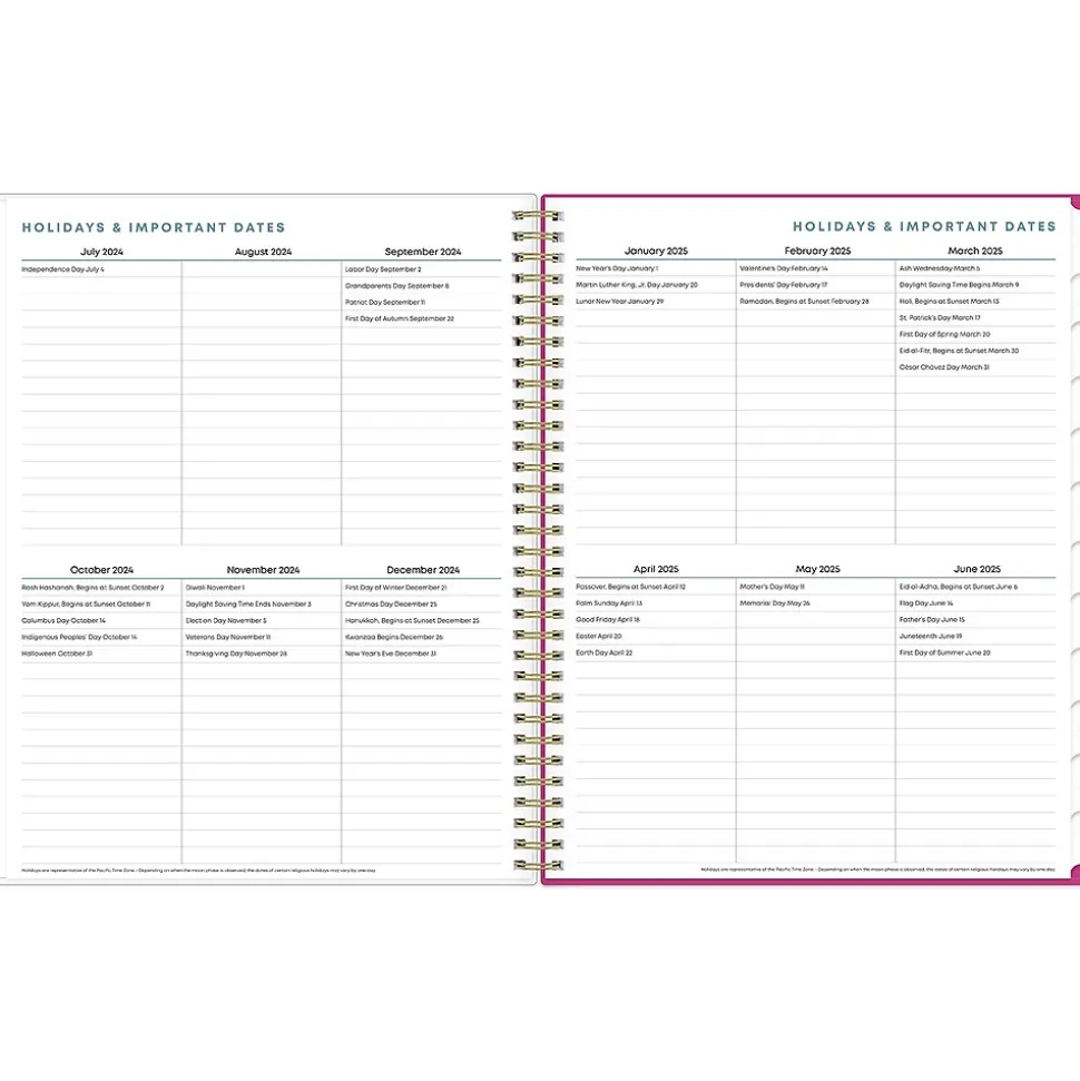 - Weekly and monthly planner covers a 12-month academic date range from July 2024 to June 2025