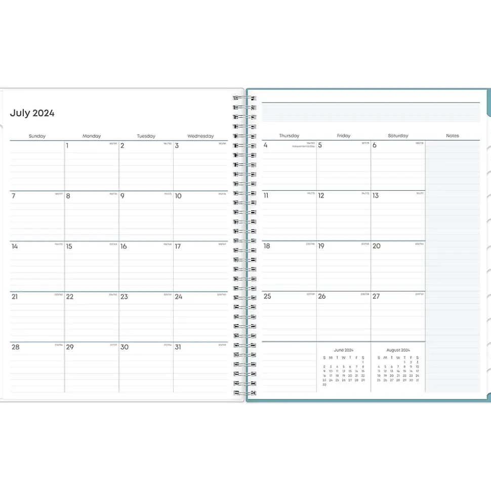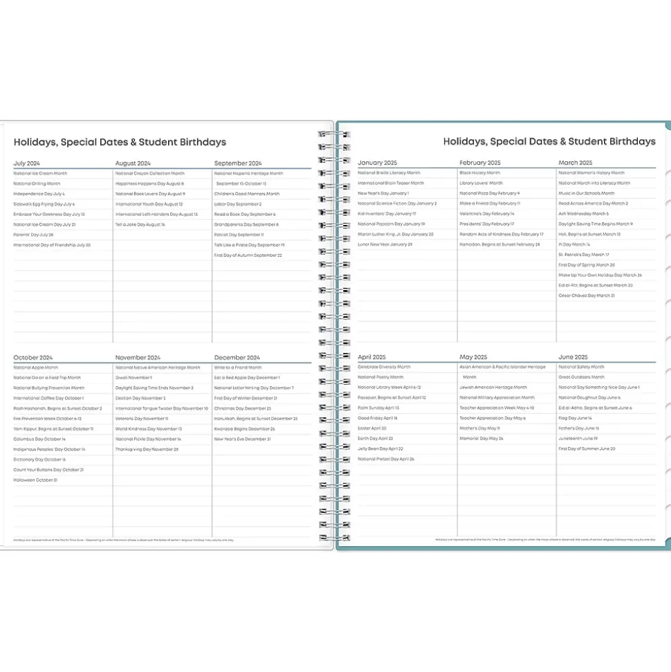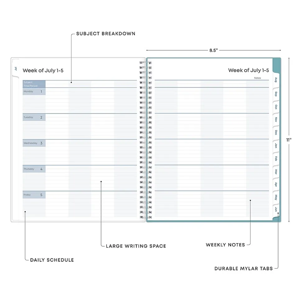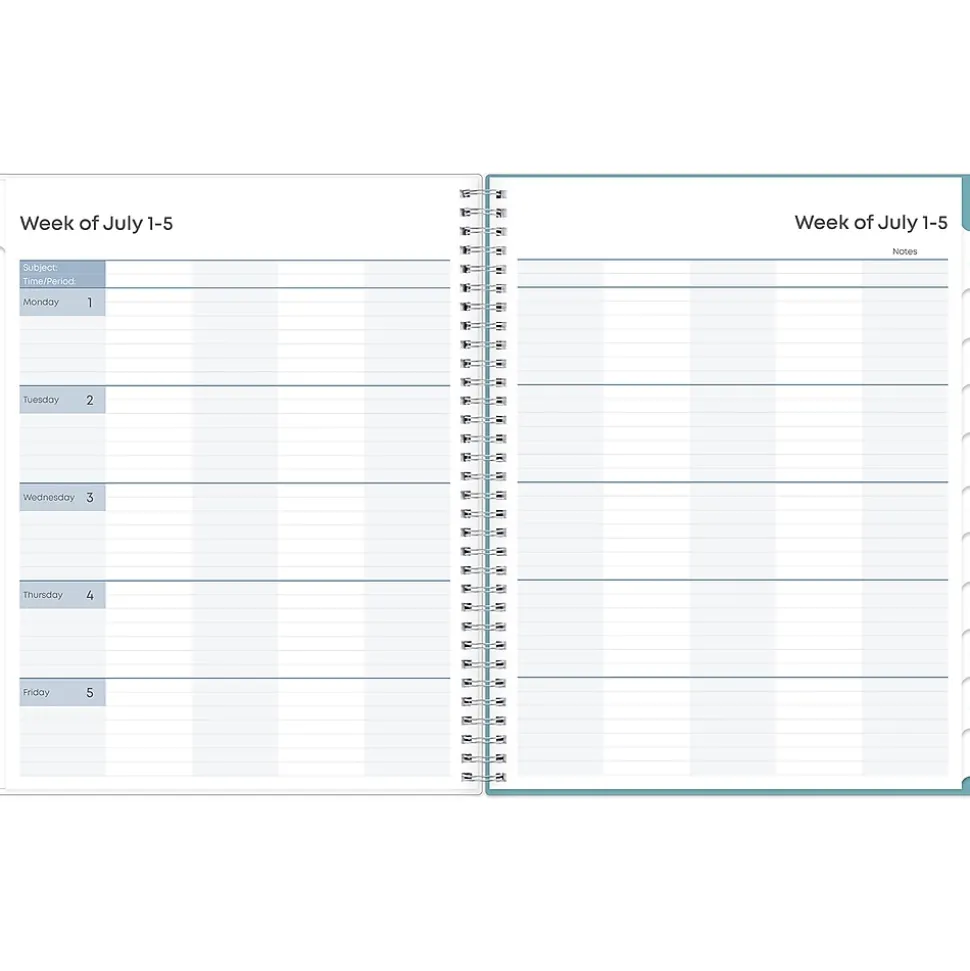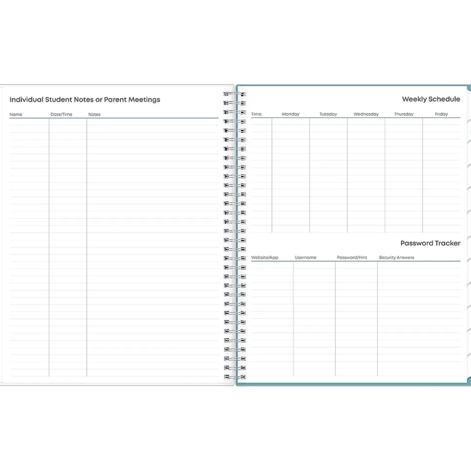 This Blue Sky Teacher Lesson Dots planner has weekly planning space for up to nine classes or subjects. Monthly pages are tabbed and offer plenty of room for notes. Extras include a storage pocket and pages for weekly activities, class birthdays, and holidays.