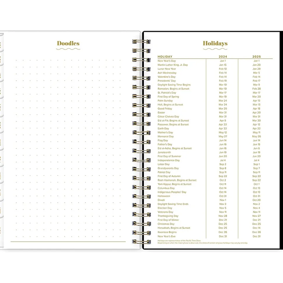 - One week per view, one month per view, notes pages, reference calendars, contacts, goals, holidays, and important dates