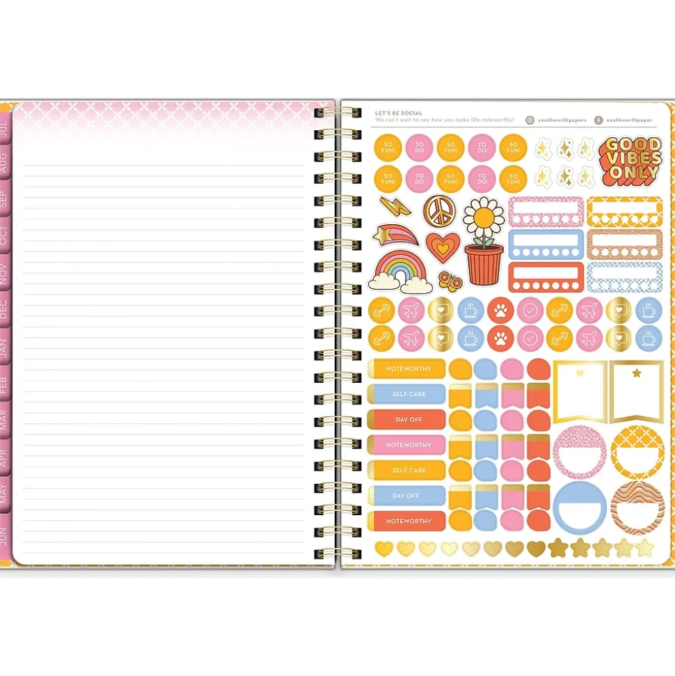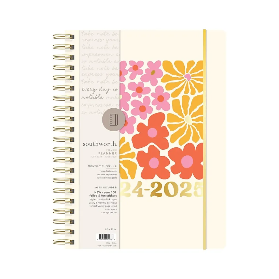 With check-in spreads and foil-enhanced stickers, this Southworth Rustic Citrus academic year planner will help you keep your personal life and school life organized. From July 2024 to June 2025, the monthly and vertical column weekly spreads allow for ample space to capture important dates and reminders. The check-in spreads provide a dedicated space to track monthly goals, thoughts, and dreams. Inside, you will find a yearly overview for a quick way to remember holidays and special events, and a storage pocket to secure loose papers and accessories. Don’t forget about the 100 foiled and fun stickers. Southworth’s durable cover and retro design coordinate beautifully with the elastic closure and metal accents to hold the pages in place. Note goals and events so that nothing important is ever missed. Every day is notable.