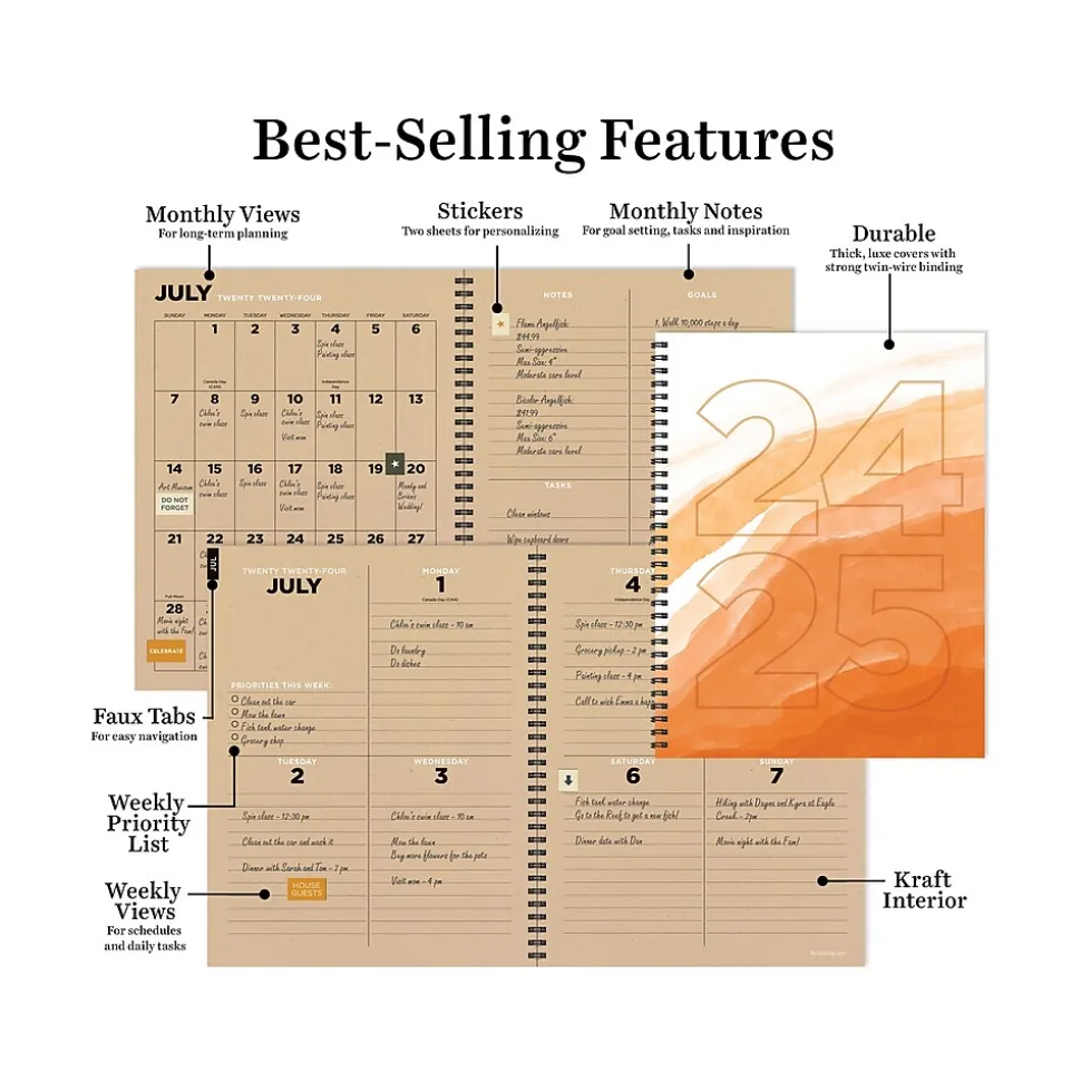 - Weekly views for schedules and daily tasks with a weekly priority list; monthly views for long-term planning with sections for goal setting, tasks, and inspiration