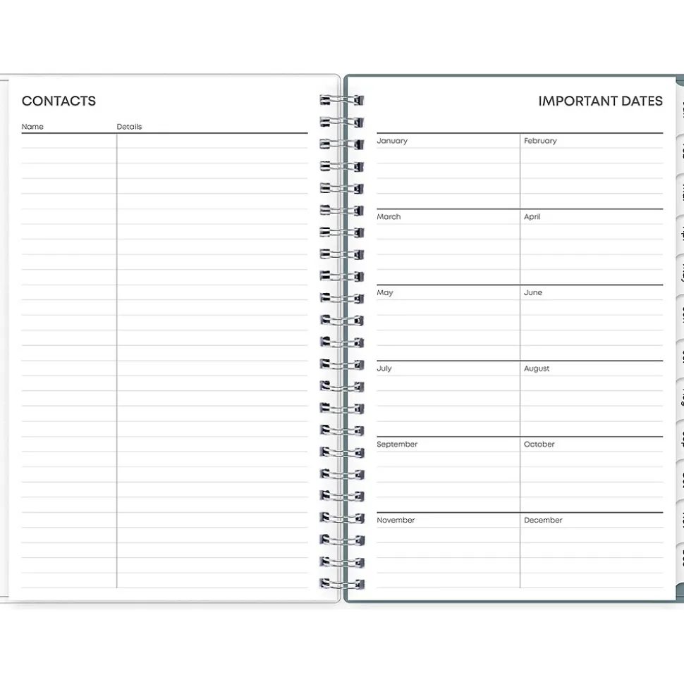 - Features one month per two pages and one week per two pages, with space for notes and quick reference calendars