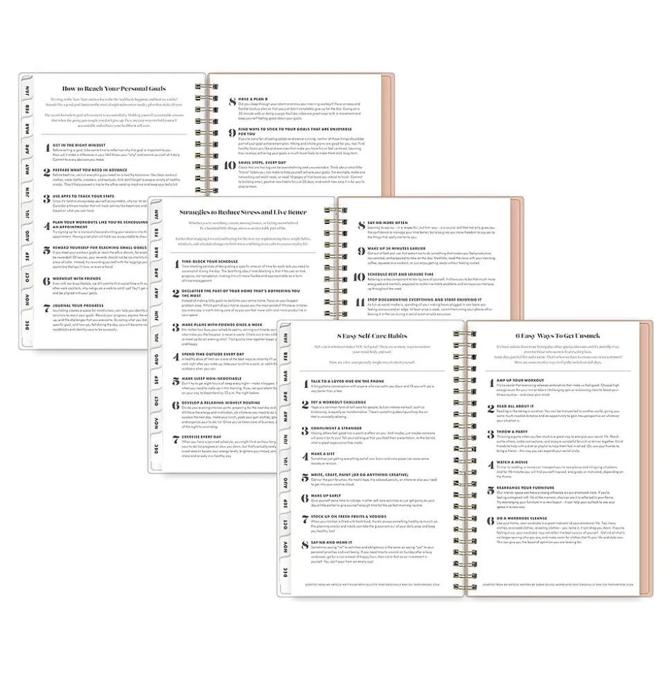 - One month per view, one week per view, notes pages, goal-setting worksheets, two-year calendar, and to-do section checkbox