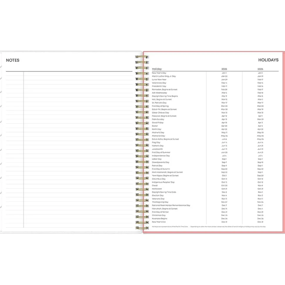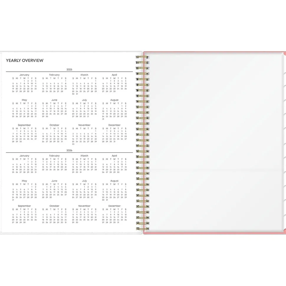 - Storage pocket, yearly overview, list of major holidays, and pages for your contacts, goals, important dates, and notes