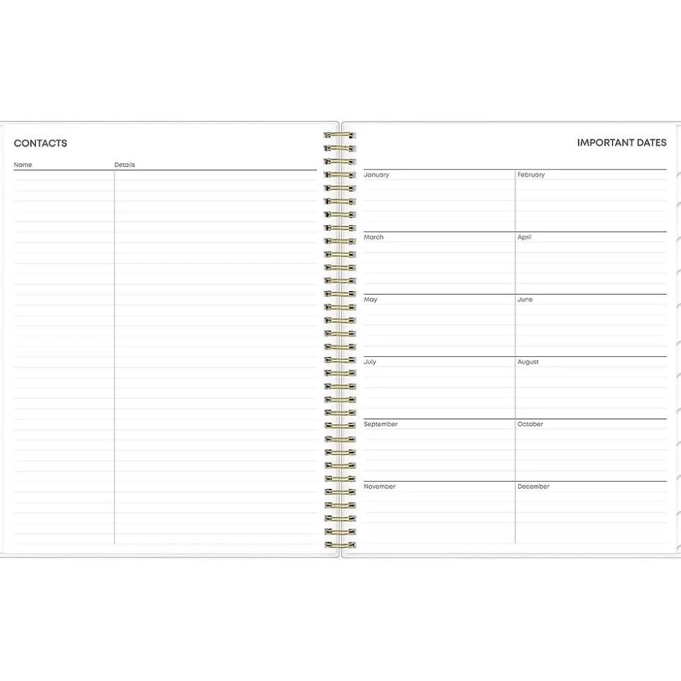 - Storage pocket, yearly overview, goals, contacts, and important dates