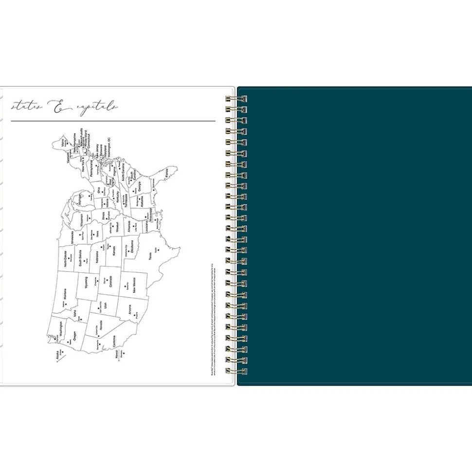 - Offers goal-focused weekly layouts with the week on the left page and sections for notes, goals, and to-dos on the right; and one month per two pages, with space for notes and quick reference calendars