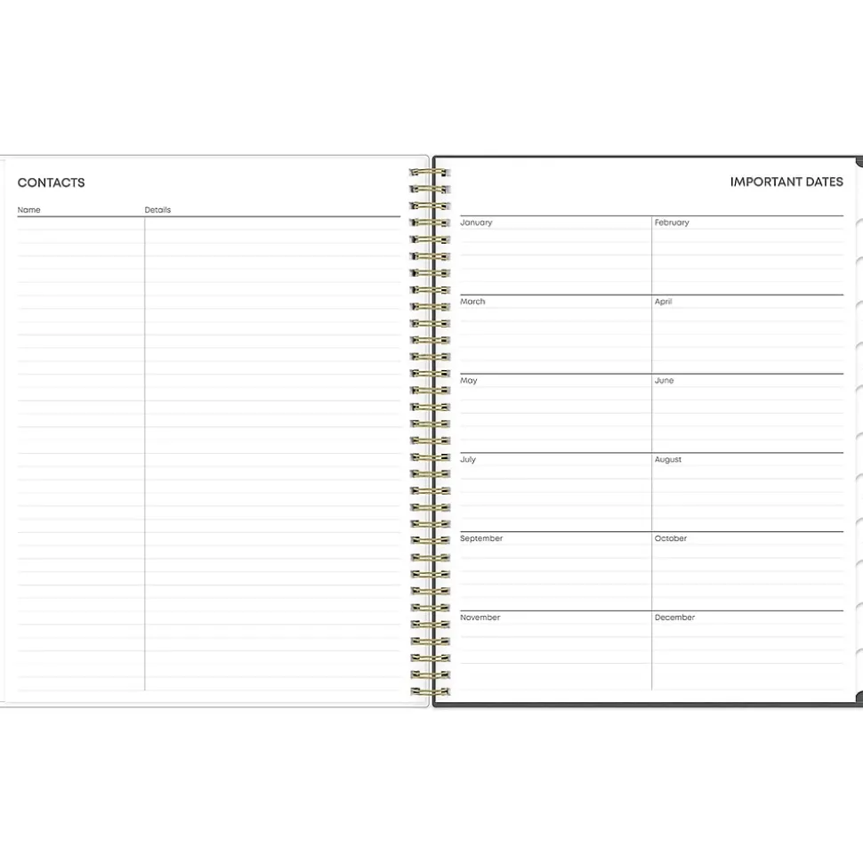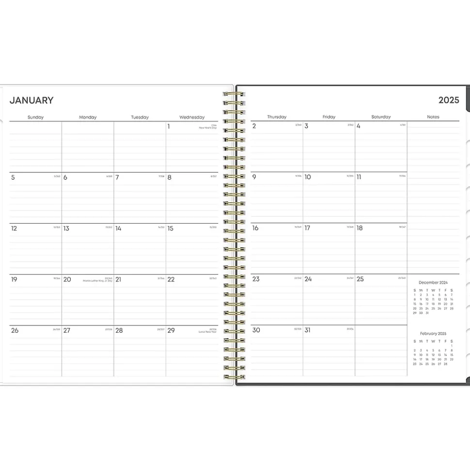 - Features one month per two pages and one week per two pages, with space for notes and quick reference calendars