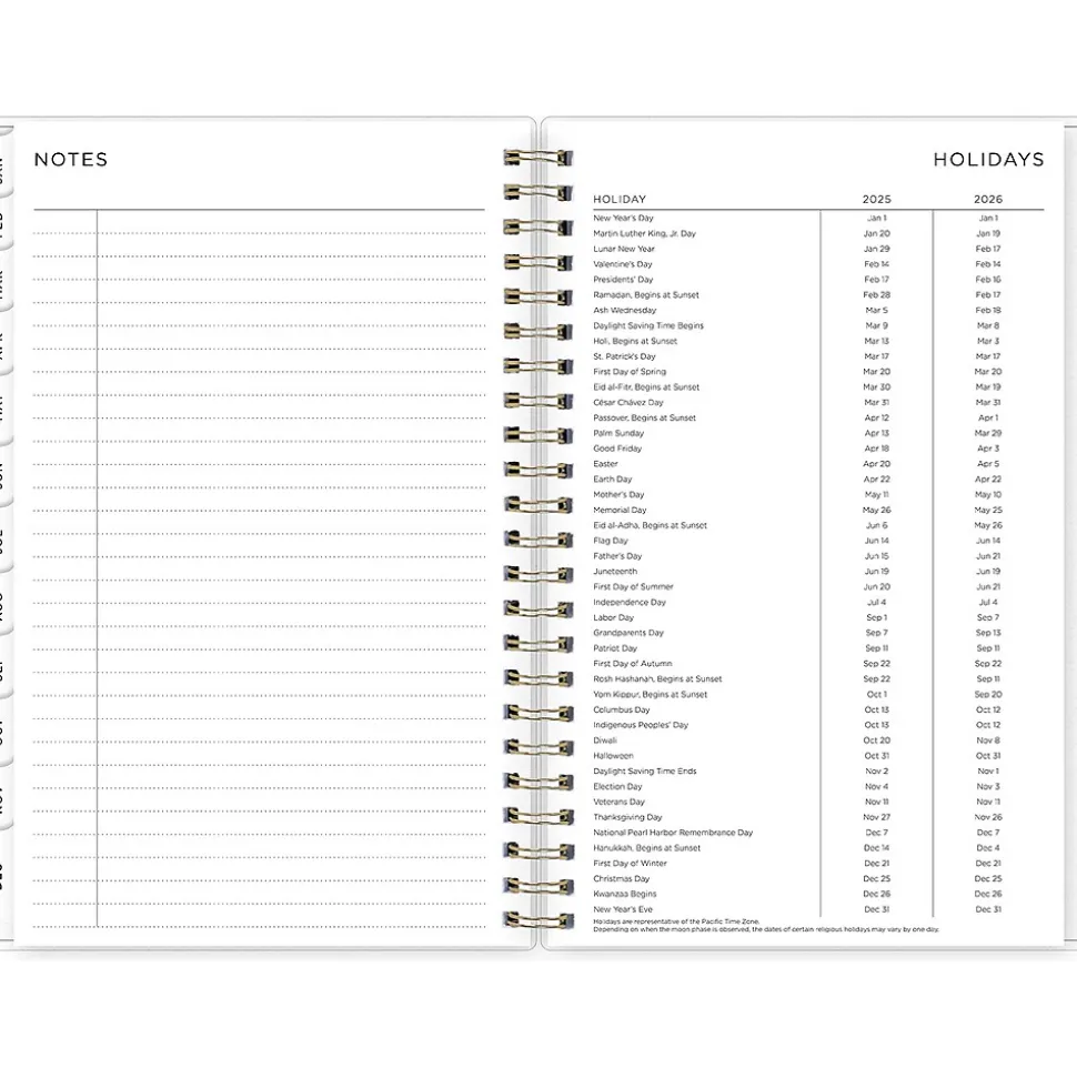 - Yearly overview, list of major holidays, and pages for your contacts, goals, important dates, and notes