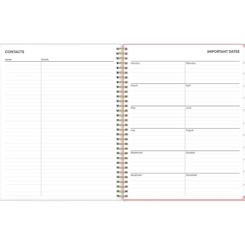 - Features one month per two pages and one week per two pages with space for notes and quick reference calendars