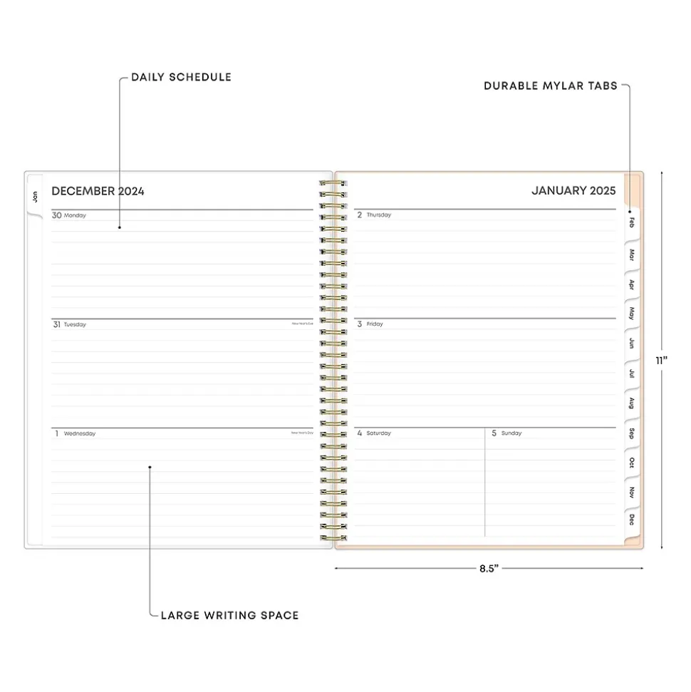 - Weekly and monthly planner covers 12 months from January 2025 to December 2025