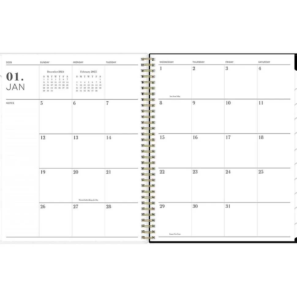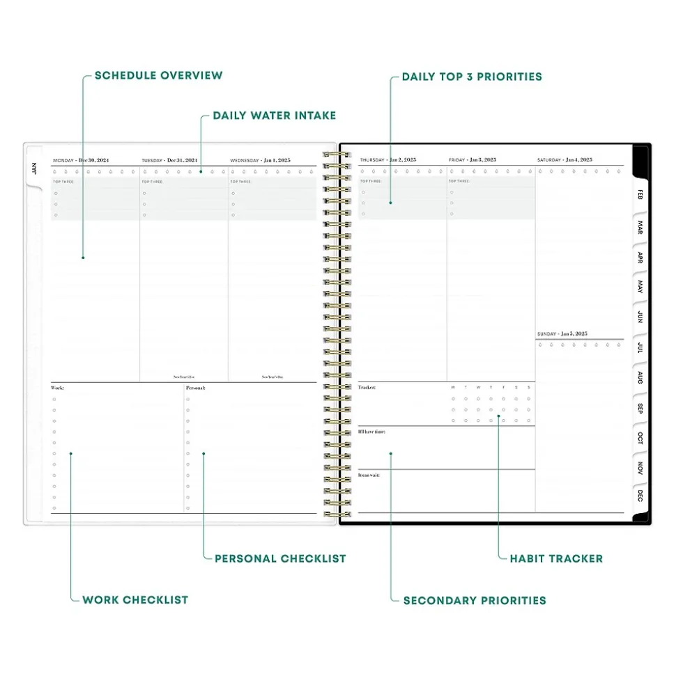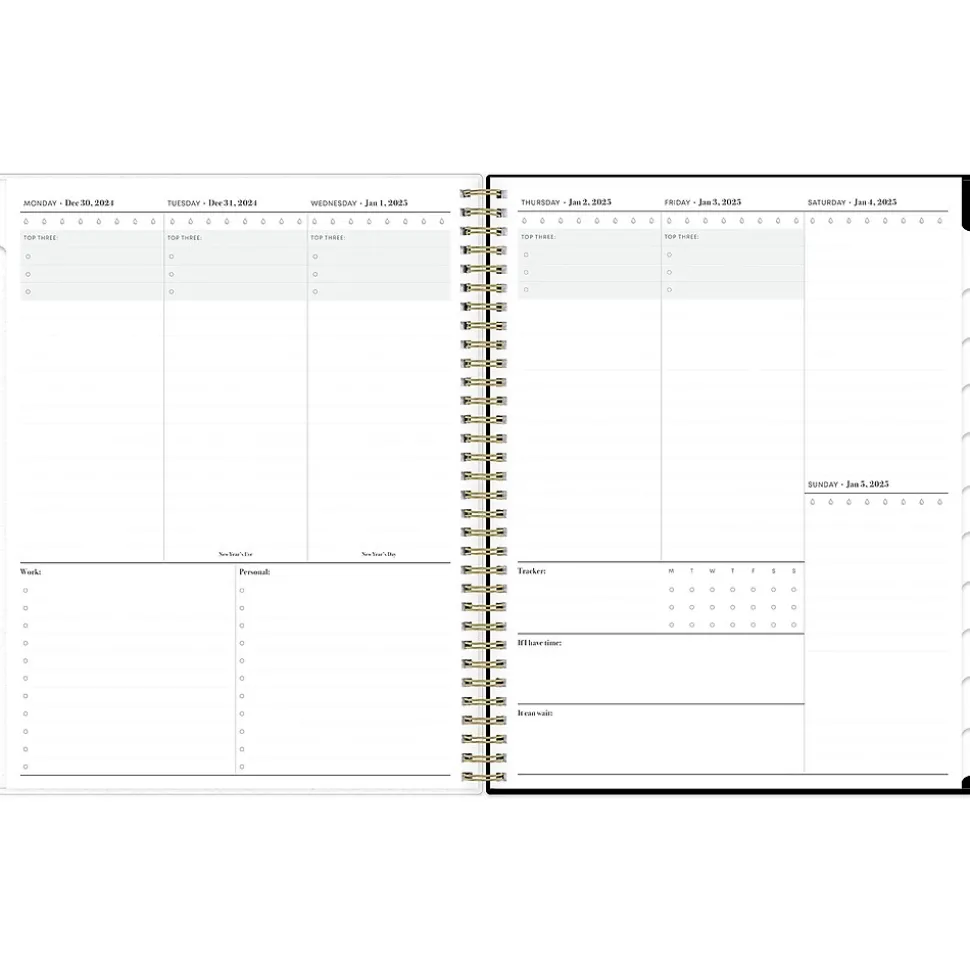 - Two-page vertical weekly spreads with sections for daily priorities, a habit tracker, and more; monthly spreads with spacious unruled daily blocks, space for notes, and quick reference calendars