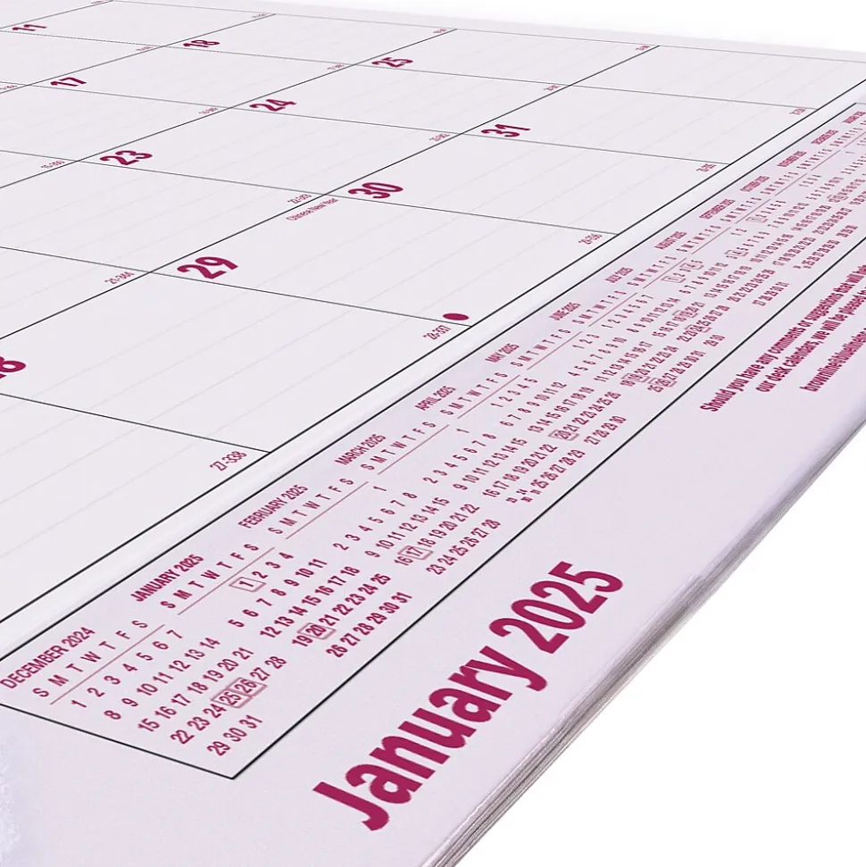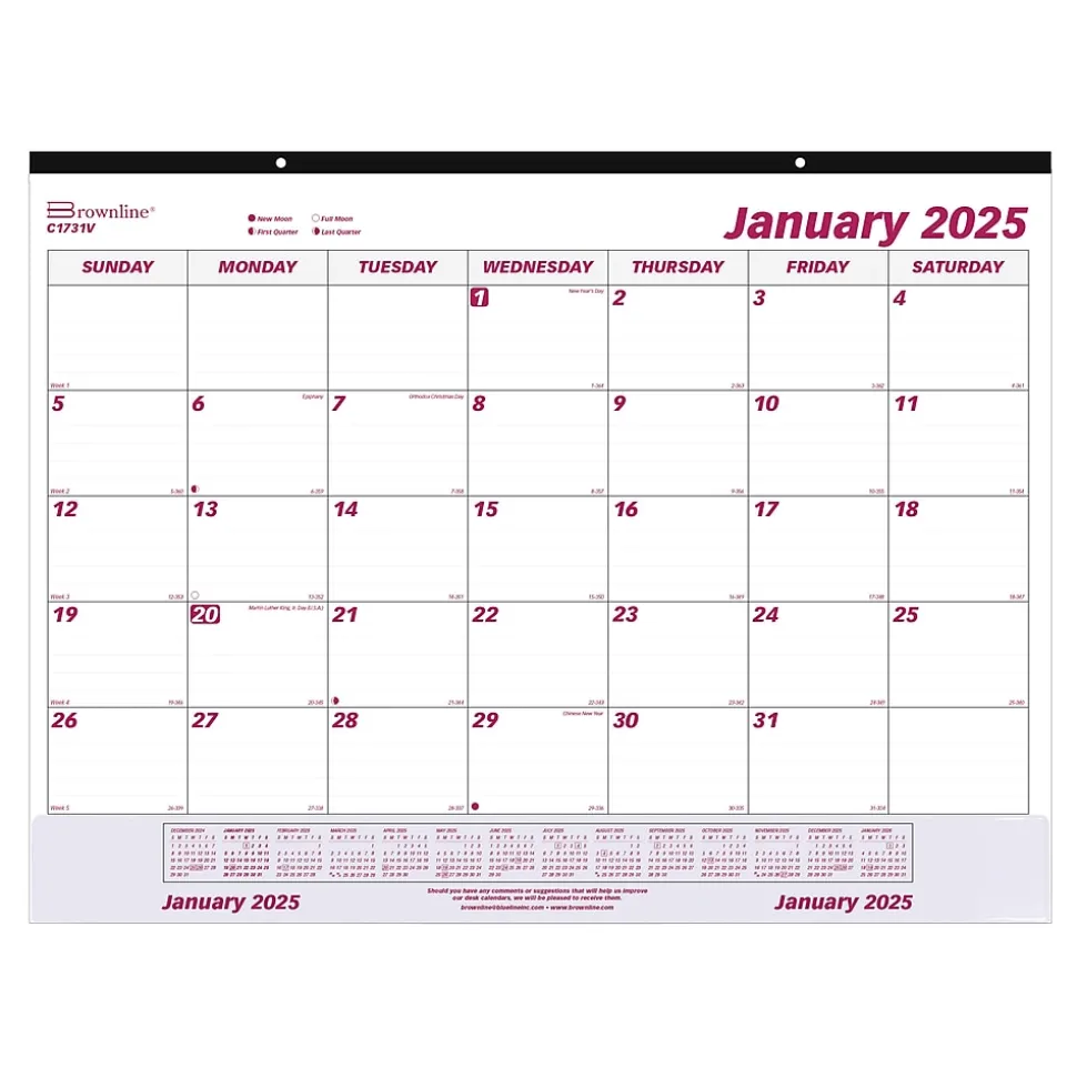 This desk or wall calendar from Brownline features a clean and modern design that covers 12 months (January to December) for complete planning all year long. The calendar is printed on high-quality paper with vinyl holder, offering tear-off sheets bound at the top and punched for hanging, as well as a reinforced chipboard backer and corners. Each sheet has a monthly grid with one ruled block per day and a yearly calendar at the bottom. Perfect for any home, school, or office with generous writing space to organize your schedule, this calendar is a great resource for managing upcoming events and deadlines. Track projects, create schedules, make daily notes, or schedule vacations: this pad will give you plenty of space to jot down important notes and reminders for the year.