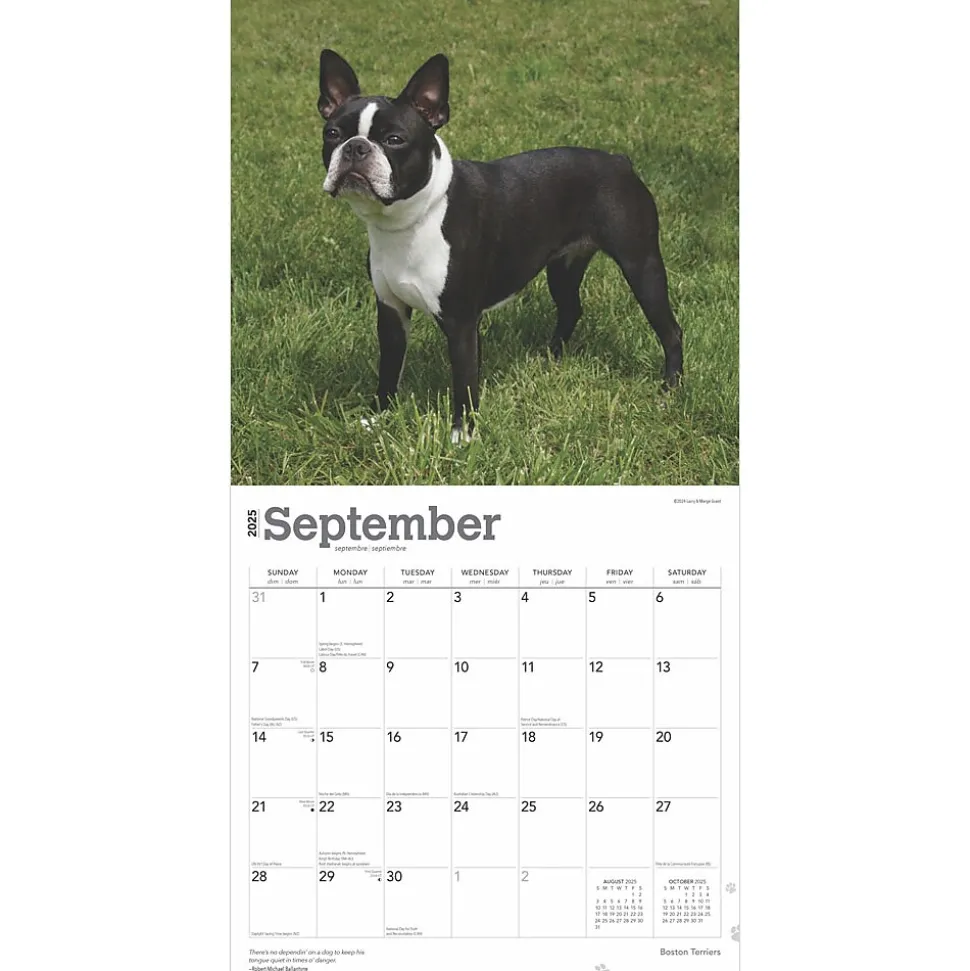 Boston Terriers, often called the “American Gentlemen,” are truly spirited dogs and one of the few breeds native to the United States. Lively, intelligent, compact, and curious, Bostons are full of spunk. With their distinctive white markings, they are also quite cute. This Boston Terriers calendar captures the big personalities of these charming little dogs.