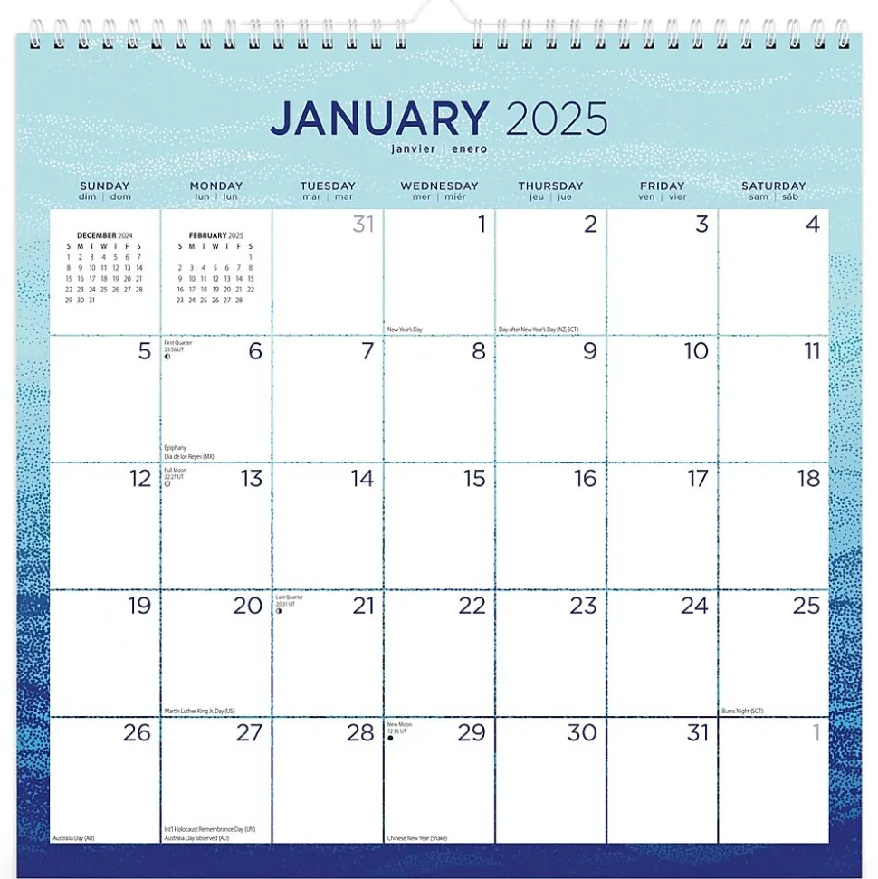 Seaside Currents’ regal shade of blue and delightful pattern adorn this calendar, evoking a sense of timeless tranquility.