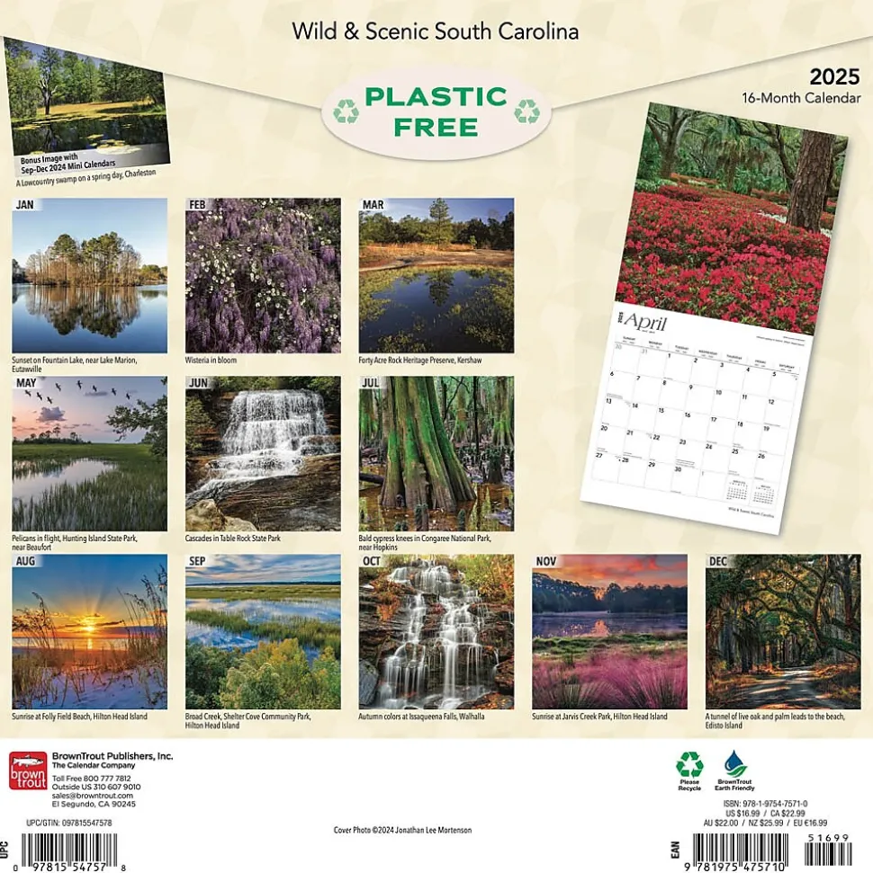 South Carolina boasts a pristine and diverse landscape of beaches, mountain wilderness, lakes, and forests. Whether you’re canoeing through a shadowy cypress swamp, strolling a palmetto-lined promenade, or watching a majestic island sunrise, South Carolina leaves you with a lasting impression. Celebrate wild and scenic South Carolina with this beautiful calendar.