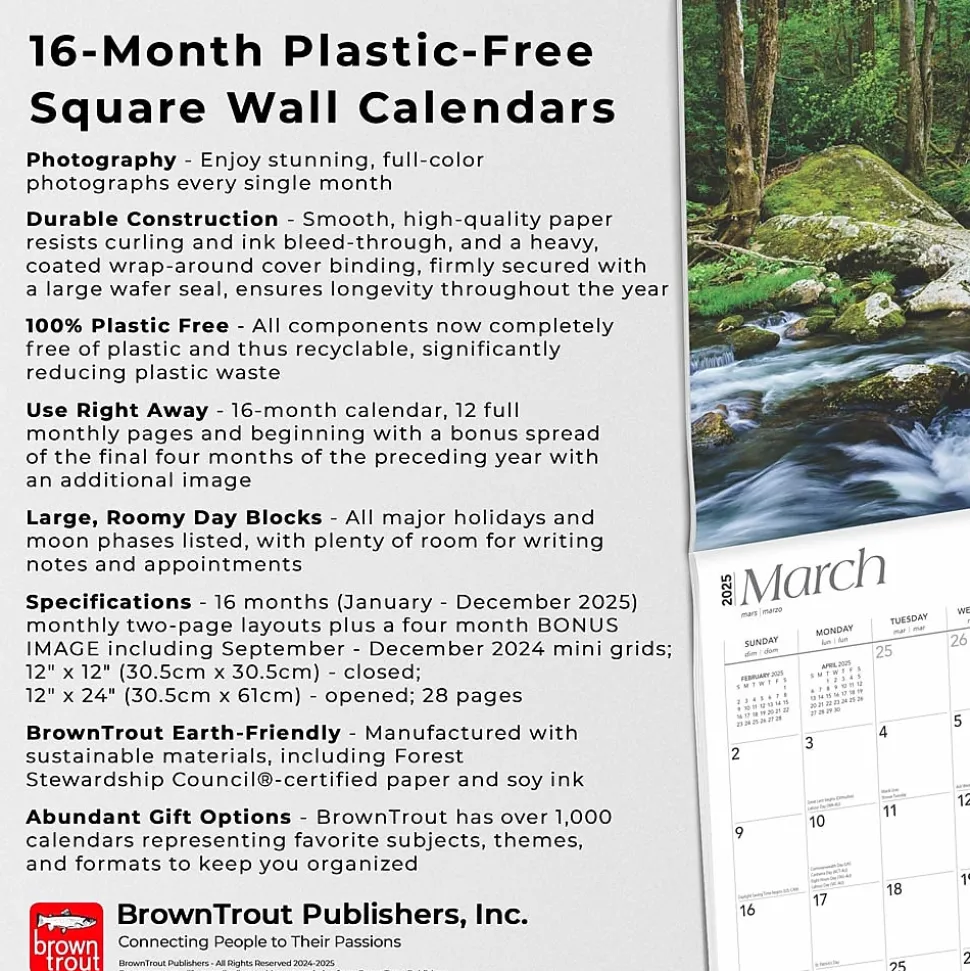 - BrownTrout Earth-Friendly – Manufactured with sustainable materials, including Forest Stewardship Council®-certified paper and soy ink
