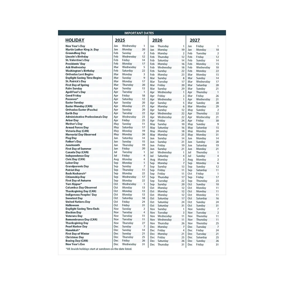 - Additional page lists important holiday dates for three years